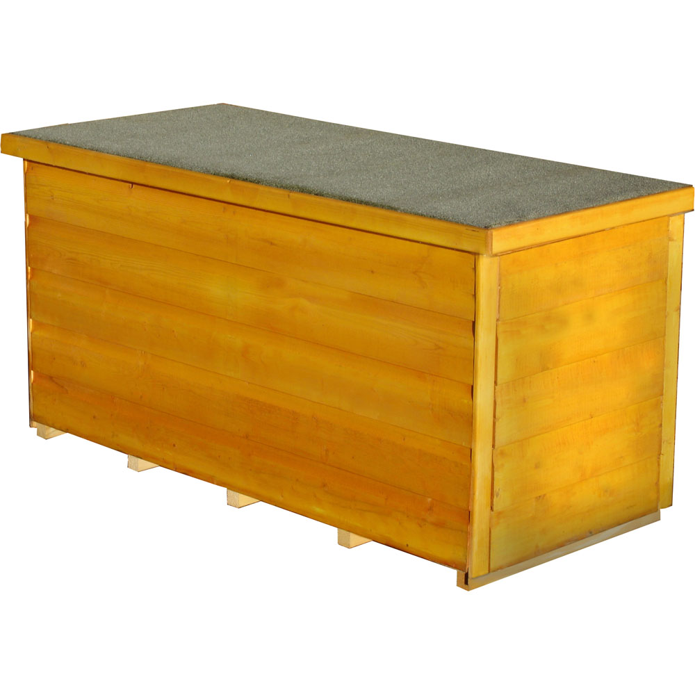 Quick and easy garden storage box, this store is economical and provides the perfect place to tidy away all those garden extras such as tools, wellies, and bird food. The list is endless. The Storage Box is perfect by the back door as it's sure to be in constant use! The side panels are made from 12mm shiplap FSC Certified timber and supplied in a honey brown timber basecoat ready for you to top coat your own colour. The lid and floor are constructed from solid board (OSB) for ease of installation. The storage chest comes complete with a fixing kit, roof felt, and installation instructions and includes Home Delivery. Please note vertical timber is sometimes used in the manufacturing of the Storage Box.Note: Currently, we're unable to deliver this product to DG, TD, KA, ML, EH, G, PA, FK, KY, PH, DD, AB IV and KW areas. We regret the inconvenience and will keep you posted when it's available to order for the mentioned postcodes.