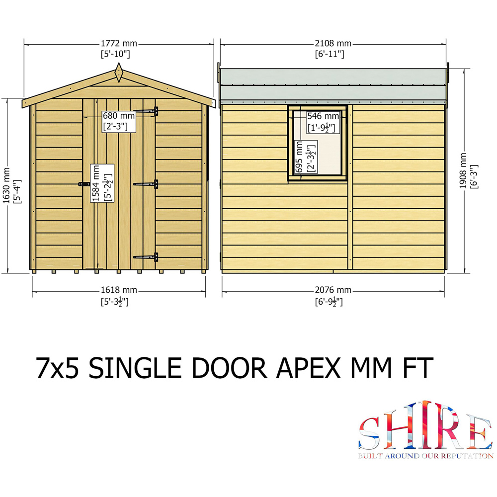 This 7 x 5ft Shiplap Wooden Shed from Shire is an attractive and well-made British shed featuring high-grade 12mm shiplap tongue and groove cladding and strong 34mm square framing. The single door is in the 5ft gable providing access for bicycles or lawnmowers. There is an opening window for added light and ventilation. The shed is ideal for storing your gardening tools or even as a small potting shed. The roof is solid sheet OSB boards and the floor is made from tongued and grooved boards, while the door is secured by a pad bolt. The shed is dip-treated with a preservative base coat ready for your own topcoat of paint or stain. Allowance should be made for the roof overhang and for access around the outside during construction and subsequent treatment. Note: Currently, we're unable to deliver this product to DG, TD, KA, ML, EH, G, PA, FK, KY, PH, DD, AB IV and KW areas. We regret the inconvenience and will keep you posted when it's available to order for the mentioned postcodes.