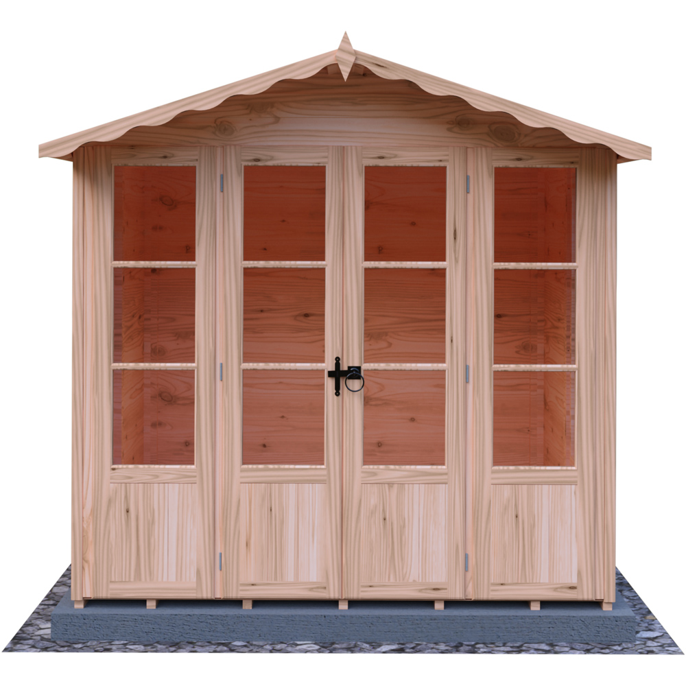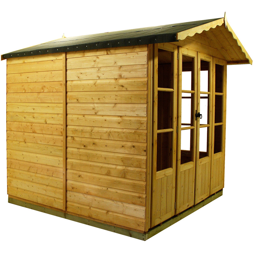 Enhance your garden with the Shire 7 x 7ft Kensington Summerhouse. It features high-quality double doors and a large side window that can be placed on either side. Constructed with 34mm square framing and planed Shiplap tongue and groove boards made from FSC-approved pine, this Summerhouse comes with a dip-treated base coat preservative for immediate customization with paint or stain. The joinery window and doors are storm-resistant. After ordering, you will receive a link to select your delivery day and live tracking information on the morning of delivery. Ensure you have a flat, level base ready before assembly. Note: Delivery is available to most areas, but currently not to DG, TD, KA, ML, EH, G, PA, FK, KY, PH, DD, AB IV, and KW postcodes. We apologise for any inconvenience and will update you once delivery is possible to these areas.
