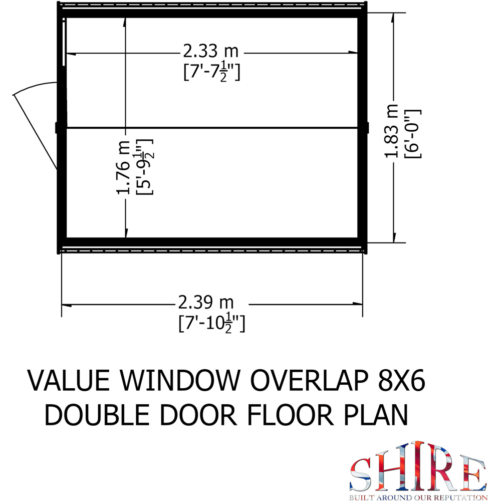 The 8 x 6ft Shire Overlap Wooden Shed with Window is incredible value for money. It is manufactured from high grade, slow grown, FSC approved, pine cladding boards over 34mm square framing, while the roof and floor are constructed from solid sheet OSB. The single door is fitted with a hasp and staple catch ready for your own padlock. The roof is finished with green mineral felt and the building is dip treated with a basecoat ready for top coating immediately after assembly. All fixings, roof felt and assembly instructions are provided. (Imperial dimensions are approximate to the nearest foot, please refer to the exact metric dimensions given).