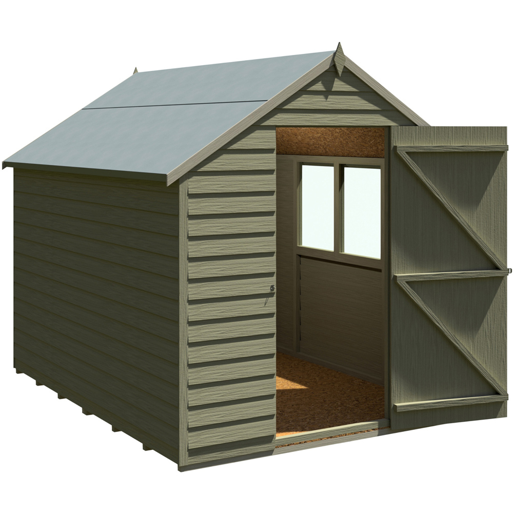 Enhance your garden with the Shire 8 x 6ft Overlap Apex Shed with a window. It is crafted from high-quality FSC-approved European pine cladding boards and sturdy 34mm square framing. The shed features a single door with a hasp and staple catch for security, a solid sheet OSB roof and floor, and green mineral felt finishing on the roof. This model includes one fixed, acrylic window and the roof is finished with green mineral felt. Please note: After placing your order, you will receive a link to select your delivery day and live tracking information on the morning of the delivery. Before assembly, ensure you have a flat and level base of adequate size, as grass, soil, or gravel may not provide sufficient stability for the shed. Delivery is available to most areas, but currently not to DG, TD, KA, ML, EH, G, PA, FK, KY, PH, DD, AB IV, and KW postcodes. We apologise for any inconvenience and will update you once delivery is possible to these areas.