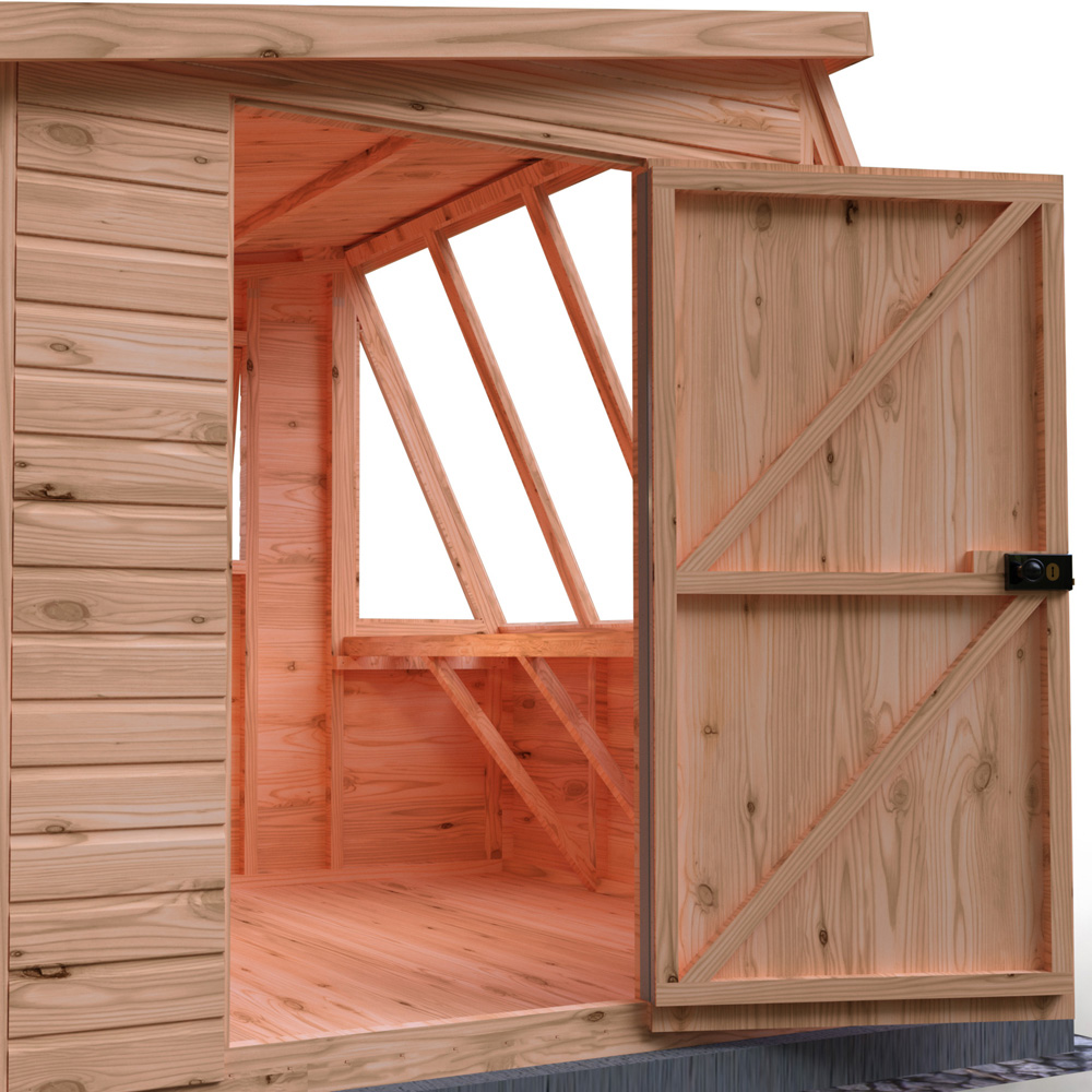 Shire Potting Shed Style A 8 x 8 is a practical Iceni potting shed that creates a lovely hobby room and looks great in the garden. The Iceni has everything you'd want, with a lockable solid door to the side and a work bench across the front. The big window at the front is glazed with styrene for safety, and the opening side window is glass. It is constructed from high-grade 12mm shiplap cladding to the walls, tongue and groove boards to the roof and floor, all on 44mm strong framing. Mineral roof felt, fixing kit, and assembly instructions are provided. Manufactured in the UK from high-grade Northern European FSC-certified timber and finished with a honey brown basecoat preservative treatment ready for your own top coat of stain or paint. Imperial measurements are rounded, so please refer to the metric sizes for accuracy. Allowance should be made for the roof overhang and for access around the outside during construction and subsequent treatment.Note: Currently, we're unable to deliver this product to DG, TD, KA, ML, EH, G, PA, FK, KY, PH, DD, AB IV and KW areas. We regret the inconvenience and will keep you posted when it's available to order for the mentioned postcodes.