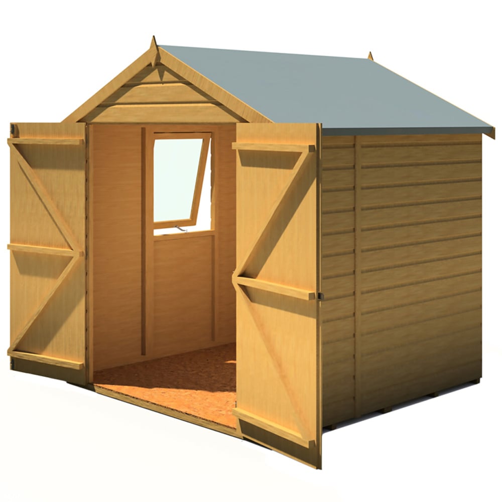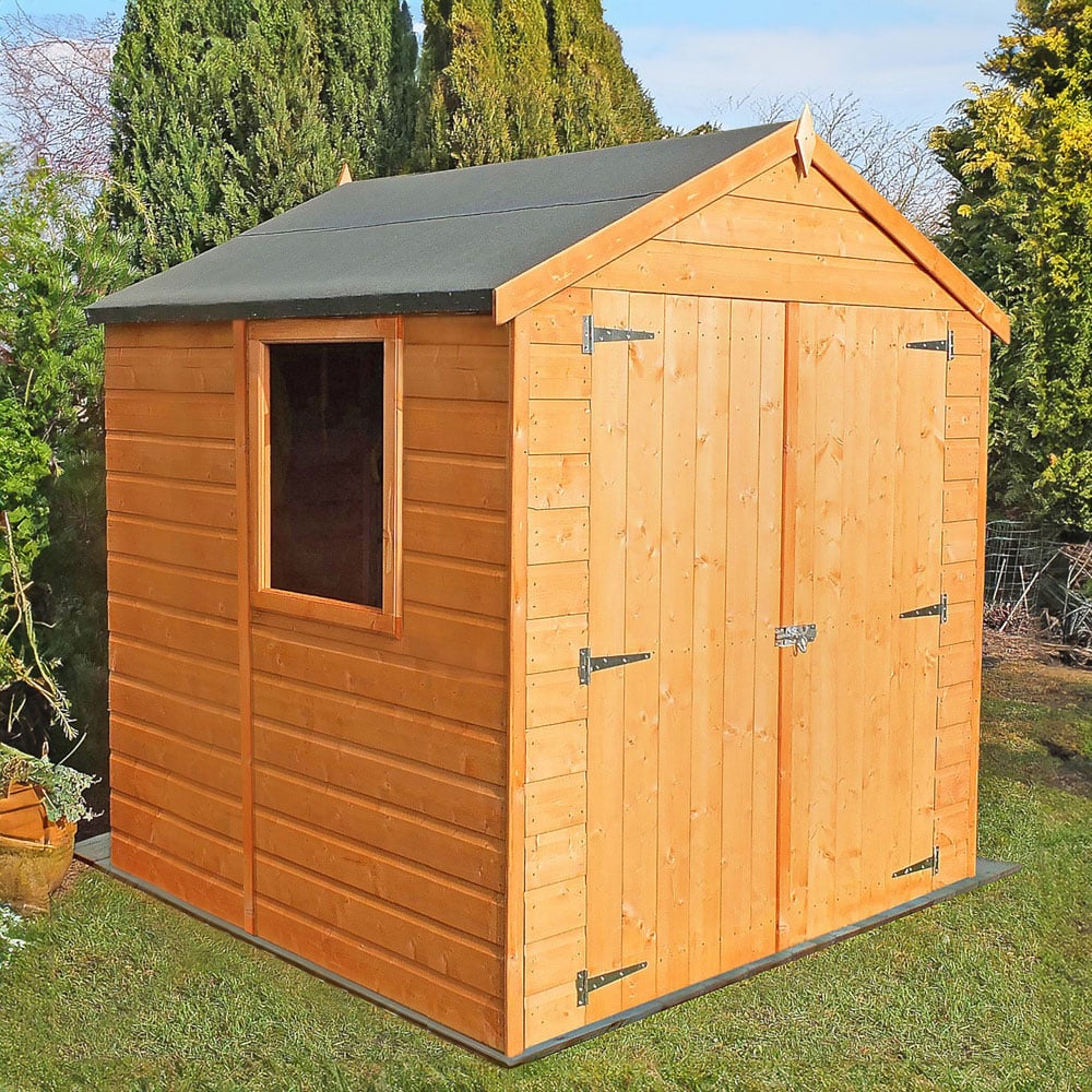 The 6 x 6ft Arran Shiplap Wooden Shed from Shire is a popular British shed manufactured from high grade, FSC approved timber with 12mm shiplap tongue and groove cladding and sturdy 34mm square framing. The wide double doors make for easy access to the entire space and with a generous eaves height, it offers ideal storage space for equipment, tools and furniture. The opening joinery window is storm resistant and the building benefits from tongue and groove timber flooring with a solid sheet roof. The shed is dip treated with a preservative base coat ready for your own topcoat of paint or stain. Allowance should be made for the roof overhang and for access around the outside during construction and subsequent treatment. For critical dimensions use the metric values; imperial dimensions are rounded for description only.Note: Currently, we're unable to deliver this product to DG, TD, KA, ML, EH, G, PA, FK, KY, PH, DD, AB IV and KW areas. We regret the inconvenience and will keep you posted when it's available to order for the mentioned postcodes.
