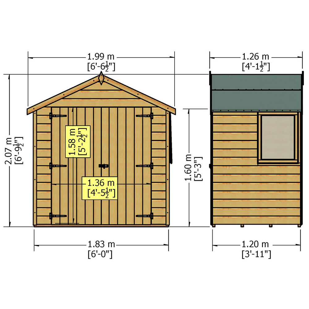 This 4 x 6ft Bute Shiplap Wooden Shed from Shire is an attractive and well-made British shed featuring high-grade 12mm shiplap tongue and groove cladding and sturdy 34mm square framing. The double doors in the 6ft (1790mm) gable provide wide access for bicycles or lawnmowers. There is an opening, joinery made, window for ventilation. The shed is ideal for storing your gardening tools or even as a small potting shed. Both roof and floor are solid sheet OSB boards. The double doors are secured by a hasp and staple lock ready for your own padlock. The shed is dip treated with a preservative base coat ready for your own topcoat of paint or stain. Allowance should be made for the roof overhang and for access around the outside during construction and subsequent treatment. For critical dimensions use the metric values; imperial dimensions are rounded for description only.Note: Currently, we're unable to deliver this product to DG, TD, KA, ML, EH, G, PA, FK, KY, PH, DD, AB IV and KW areas. We regret the inconvenience and will keep you posted when it's available to order for the mentioned postcodes.