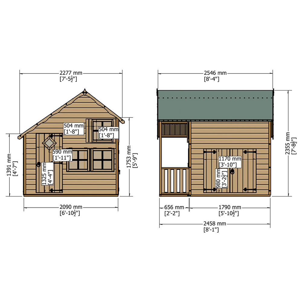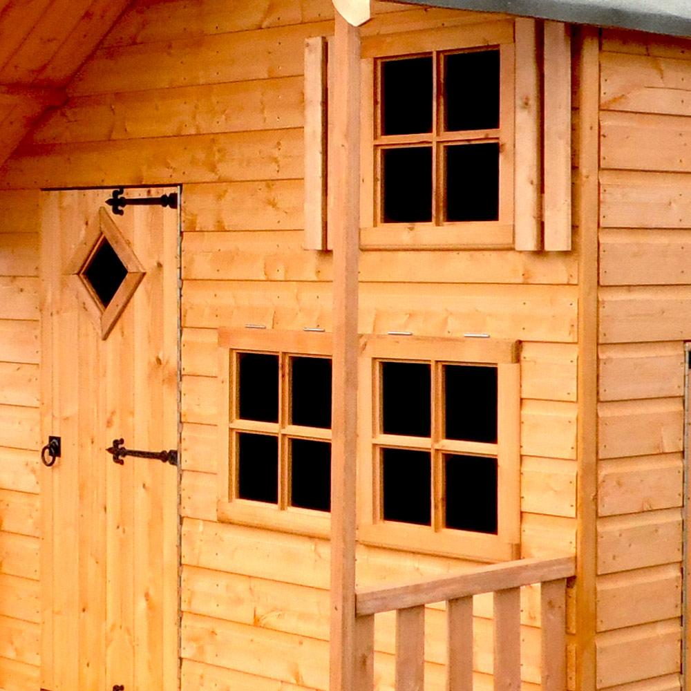 This Crib Playhouse from the Shire has everything; a lounge, a bedroom and a garage with double doors, what more could a child need! There is plenty of room for children and toys in this spacious playhouse and they will enjoy it for many years. It is made from high-grade, FSC-approved, Northern European pine shiplap boards and the joinery-made windows and doors are all mortice and tenon joints. The building has a sturdy 34mm square framing and the roof and floor are both T&G. It complies with EN71 the safety standard and carries the CE mark. It is delivered in a honey brown base coat treatment ready for painting with your choice of topcoat following installation. All fixings, roof felt and assembly instructions are provided.Note: Currently, we're unable to deliver this product to DG, TD, KA, ML, EH, G, PA, FK, KY, PH, DD, AB IV and KW areas. We regret the inconvenience and will keep you posted when it's available to order for the mentioned postcodes.