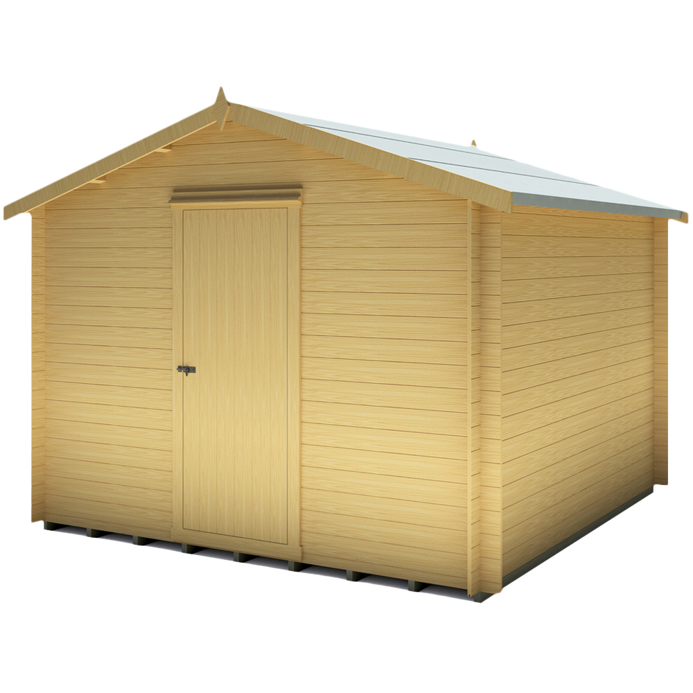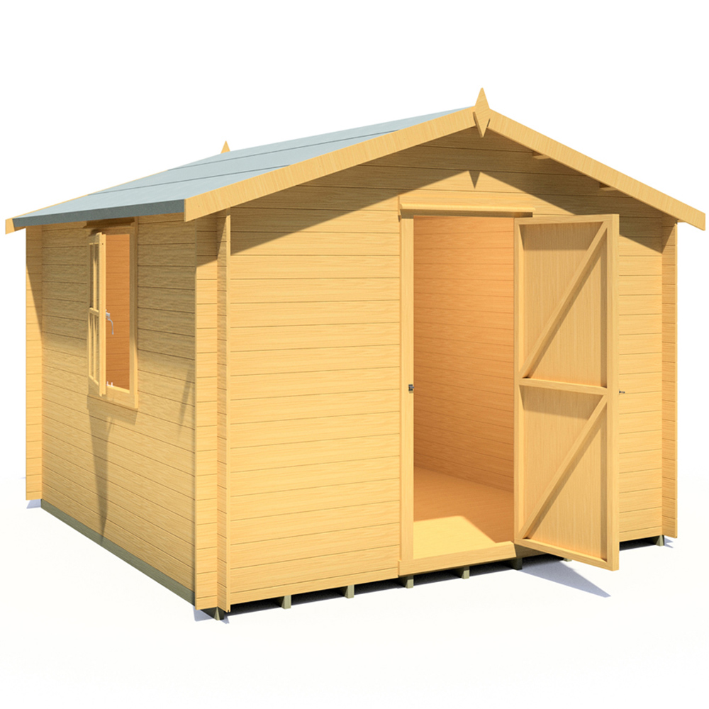 Make a soothing and functional addition to your outdoor space with the Shire Danbury 10 x 10ft Log Cabin. It is a robust log cabin manufactured using high-grade FSC approved pine wood with a window and a fully framed single door. This cabin features a tongue and groove roof, and a floor with pressure-treated bearers. The door is fully framed with a pad bolt and features a full-length piano-style hinge to improve security. The interlocking timbers that make up the walls are 19mm thick while the roof and floor timbers are 12mm thick. The cabin is supplied untreated, ready for you to paint or stain immediately after assembly. Please check internal floor sizes as building dimensions are to the edge of the individual boards that make up the cabin and will include the crossover of the logs. Please note that log cabins are supplied as individual log boards assembled by length, built up from the floor, not pre-made panels. Please note: Assembly instructions and mineral roof felt are included. Following your order, you will be sent a link to choose your delivery day. On the morning of delivery day, you will also receive live tracking information. This cabin needs to be installed on a flat and level base. Grass, soil or gravel are not sufficient as they will move with the weight of a building. Note: Currently, we're unable to deliver this product to DG, TD, KA, ML, EH, G, PA, FK, KY, PH, DD, AB IV and KW areas. We regret the inconvenience and will keep you posted when it's available to order for the mentioned postcodes.
