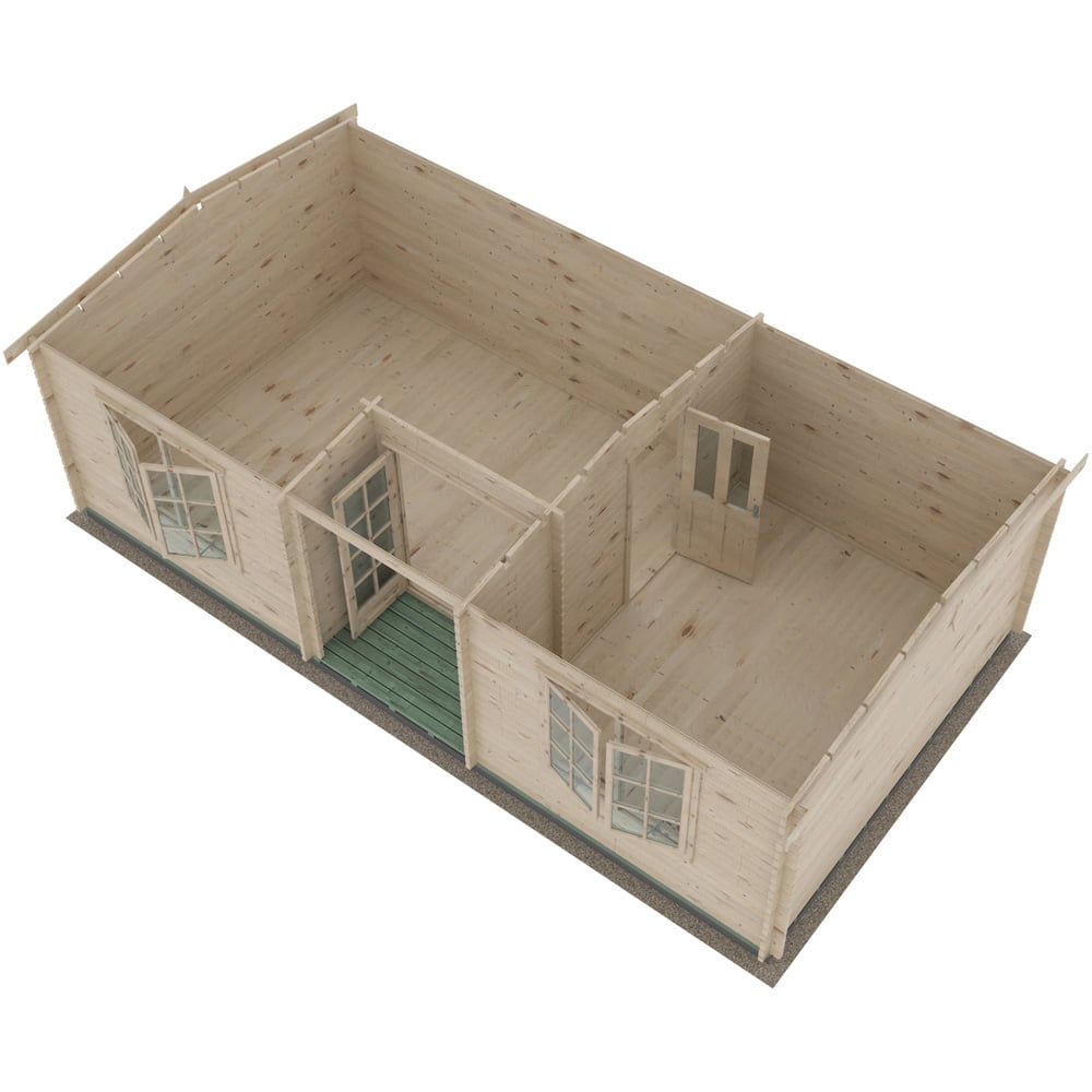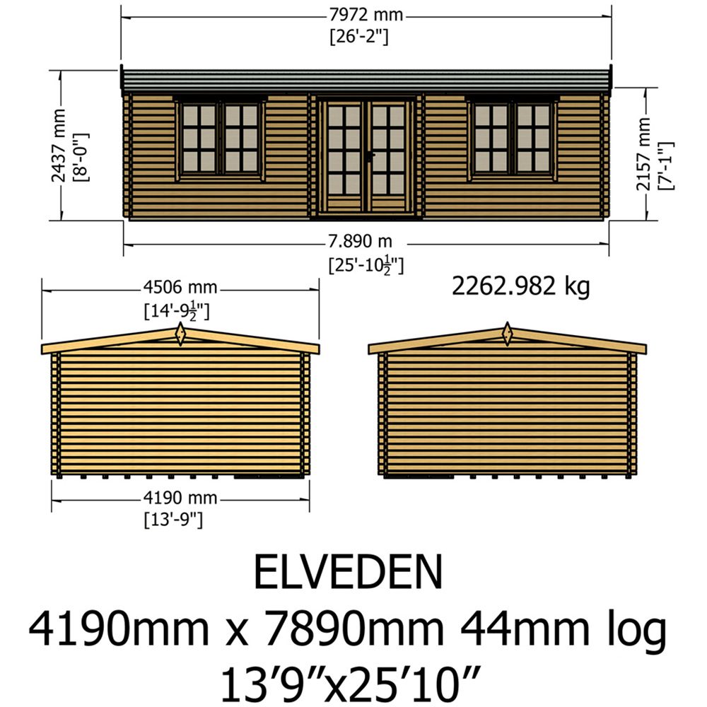 Transform your outdoor storage with Shire Elveden 14 x 26ft Log Cabin. The Elveden Log Cabin is a very popular building combining many of the attributes of a traditional summerhouse with the structure and performance of a log cabin. The interior is made up of two useful rooms. The frameless interior provides an authentic log cabin experience and with an internal height of over 7ft, it is a comfortable space for all. The interlocking timbers that make up the walls of the building are an impressive 44 mm thick. The Elveden has six opening windows providing plenty of natural light and all glazing is toughened glass. Windows and doors have high-quality mortise and tenon joinery and are fitted with draft excluders to compliment the storm-resistant design. The roof and floor are 19 mm tongued and grooved timber and the floor bearers are pressure-treated for a long life. It is manufactured from high grade, slow grown, FSC approved, northern European pine. The building is delivered untreated for painting or staining immediately following installation. Please note that log cabins are supplied as individual log boards that are assembled length by length, building up from the floor; not pre-made panels. All fixings, mineral roof felt and assembly instructions are provided. Allowance should be made for the roof overhang and for access around the outside during construction and subsequent treatment. Following your order, you will be sent a link to choose your delivery day. On the morning of delivery day you will also receive live tracking information. Before you assemble your building, you will need a base which is flat and level to a sufficient size. Grass, soil or gravel are not sufficient as they will move with the weight of a building. (Imperial dimensions are approximate to the nearest foot; please refer to the exact metric dimensions in the data given). Note: Currently, we're unable to deliver this product to DG, TD, KA, ML, EH, G, PA, FK, KY, PH, DD, AB IV and KW areas. We regret the inconvenience and will keep you posted when it's available to order for the mentioned postcodes.
