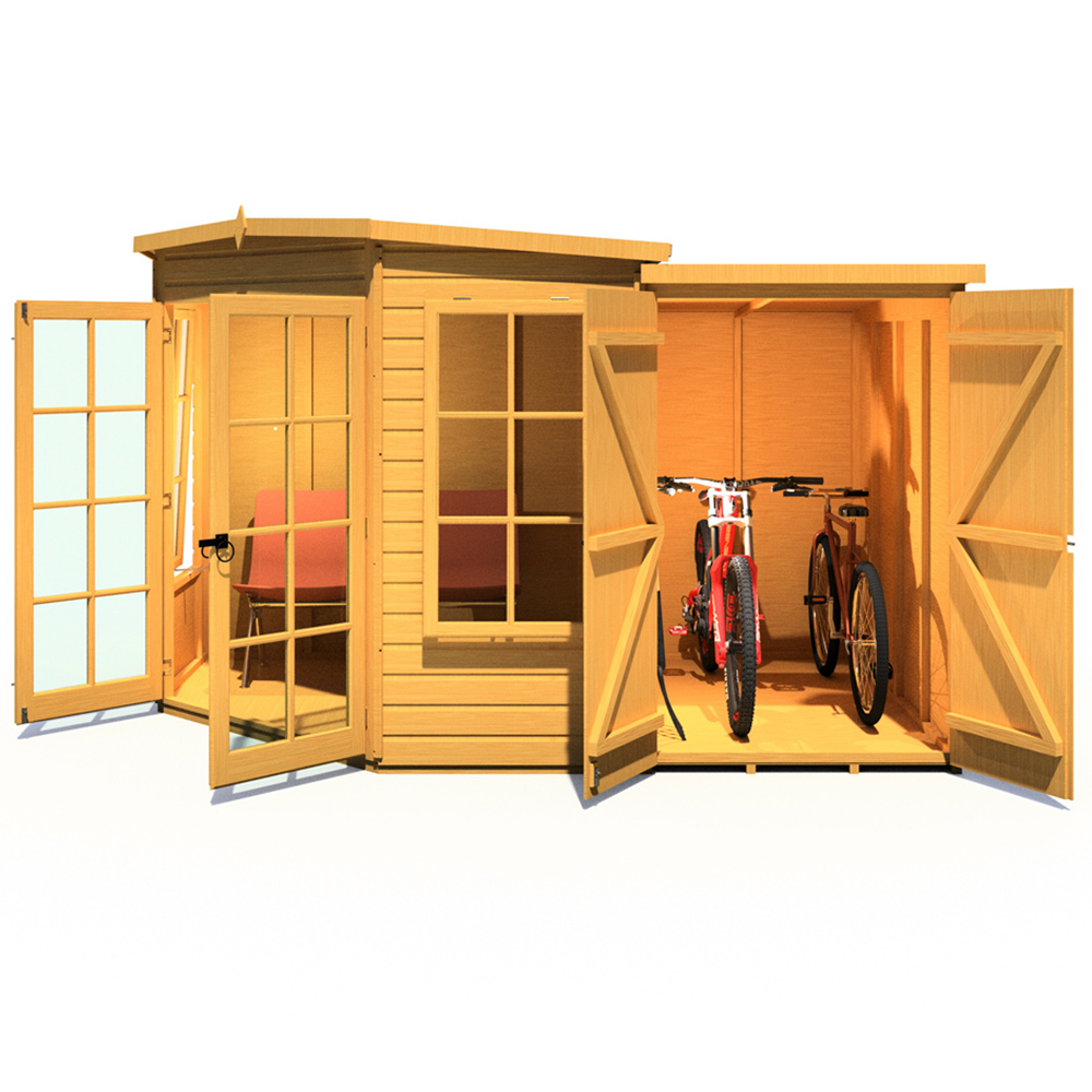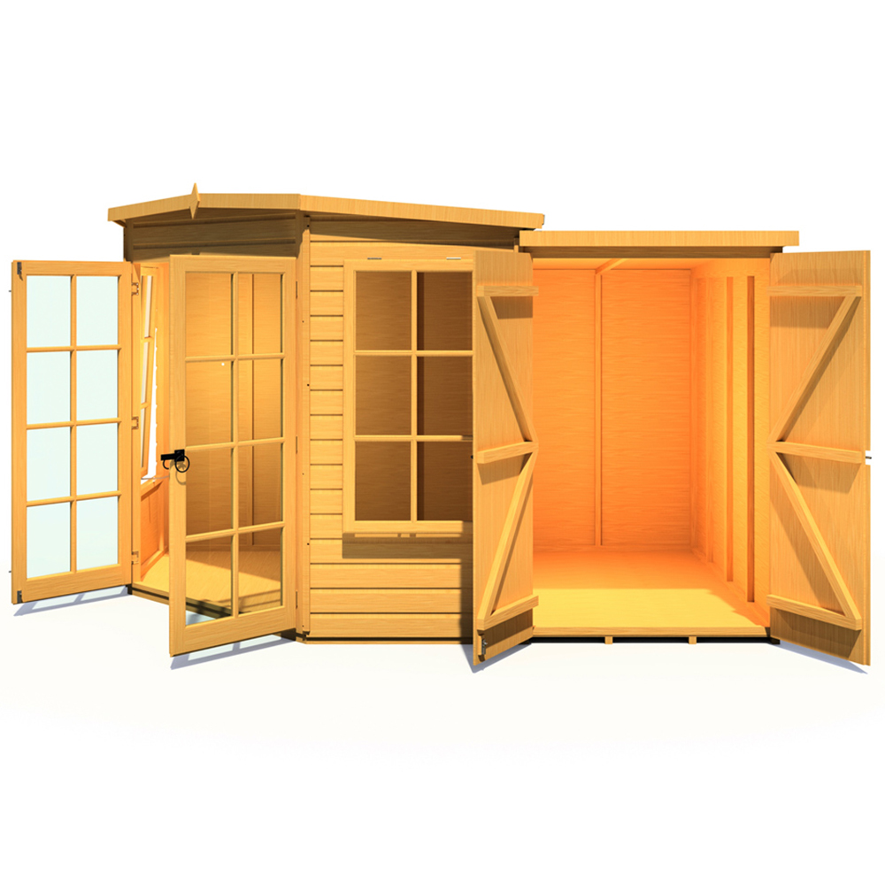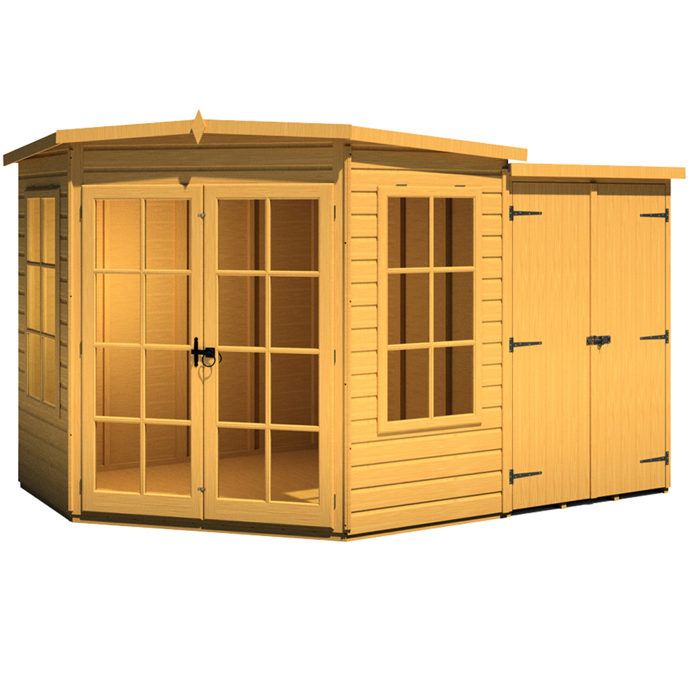Host memorable evenings in your outdoor oasis with the Shire Hampton 7 x 11ft Double Door Corner Summerhouse with Side Shed. Designed to fit neatly into the corner, the summerhouse gives you a beautiful garden room with the bonus of a separate storage shed. The summer house has two joinery quality opening windows and fully glazed, large double doors allowing plenty of light. The building is constructed on 34mm square framing and clad with planed 12mm shiplap tongue and groove boards made only from the highest grade, slow-grown, FSC-approved Northern European pine. Plus, the floor and roof are also made from 12mm tongue and groove. To ensure your summerhouse looks stunning, it comes with a dip-treated base coat preservative ready for you to top coat to your choice immediately on installation; this could be a paint or a stain. Get ready to enjoy a summer like never before. The picture illustrates what can be achieved with decoration. When setting, allowance should be made for the roof overhang and access for painting and during installation. Before you assemble your building, you will need a flat base and level to a sufficient size. Grass, soil or gravel are not sufficient as they will move with the weight of a building. Imperial dimensions are approximate to the nearest foot. Please refer to the exact metric dimensions in the data given. Following your order, you will be sent a link to choose your delivery day. On the morning of delivery day, you will also receive live tracking information. Note: Currently, the product is not delivered to DG, TD, KA, ML, EH, G, PA, FK, KY, PH, DD, AB IV and KW areas. The inconvenience is regretted, and you will be updated when it's available to order for the mentioned postcodes.