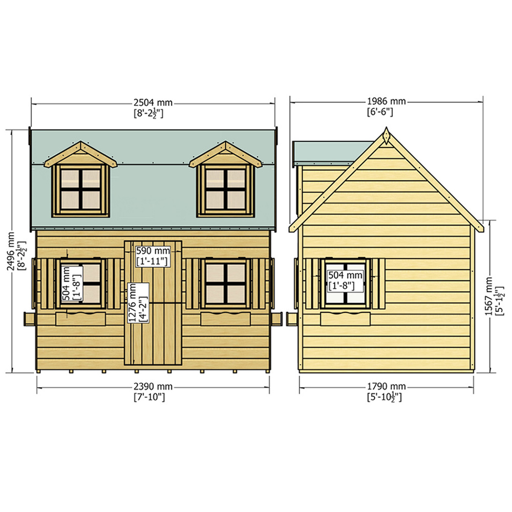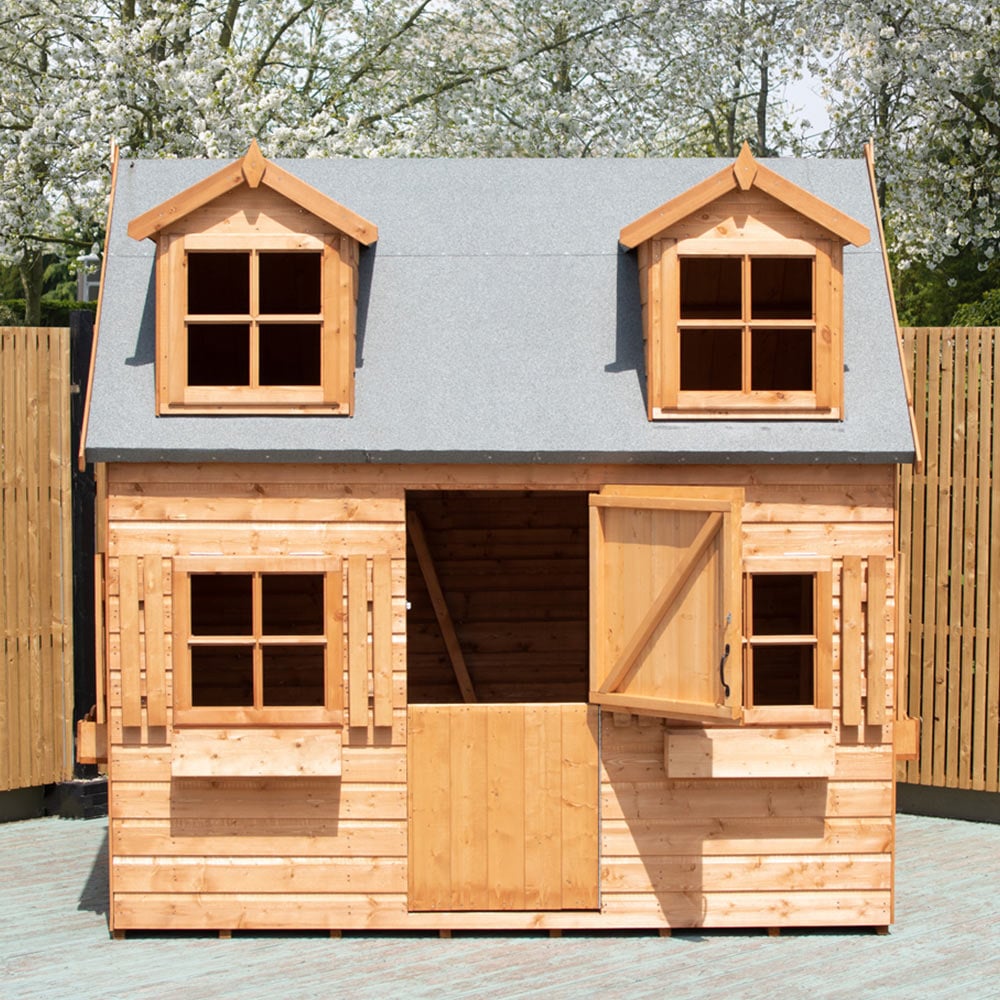 Have endless fun and capture some everlasting memories with this Shire Hatters Playhouse, a miniature mansion that adds a Wow factor to your garden. The little wonder has two floors with a small flight of steps for the upper floor with styrene glazed windows for shatter resistance, and the door is fitted with a full-length piano hinge to prevent finger traps. The floor and roof are tongue and groove (T&G) shiplap timber, which is shielded externally with green mineral felt for protection from the weather. Manufactured from high-grade, slow-grown, FSC-approved, northern European pine, the playhouse, is fully CE certified and complies with BS EN71 for the safety of your children. A dip-treated base coat preservative is applied to the house, and post installation, you can top coat immediately with wood paint or stain. The playhouse can be self-assembled with the help of two to three people using the instructions. A base which is flat and level to a sufficient size is required for the house and cannot be assembled on grass, soil or gravel as they will move with the weight of the house. Fixings and roof felt included. Post your order, a link will be sent to choose your delivery date, and on the day of delivery, you will receive live tracking information in the morning.Note: Currently, we're unable to deliver this product to DG, TD, KA, ML, EH, G, PA, FK, KY, PH, DD, AB IV and KW areas. We regret the inconvenience and will keep you posted when it's available to order for the mentioned postcodes.
