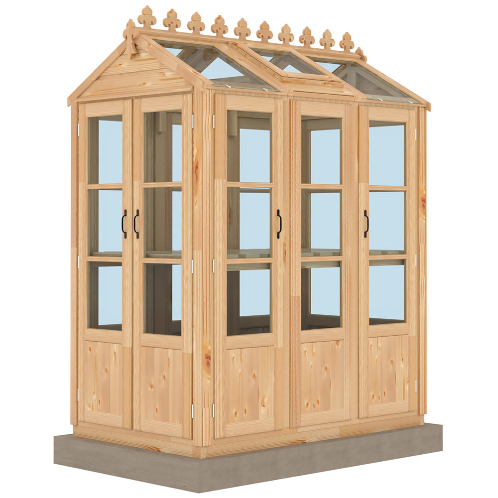 The Hemsby is a stunning greenhouse and made in Britain to a high standard. A wooden greenhouse has many advantages for gardeners and the Hemsby's clever design allows even those with a smaller garden to benefit from having a greenhouse. Featuring Shire's quality joinery, 34 mm square framing and completed with an attractive finial and cresting to the roof, the Hemsby is both practical as well as charming. The low wooden panels also add a very traditional detail to this lovely building and it comes with a handy shelf. The greenhouse is glazed with toughened glass. Four doors are supplied, each door opening is 452 x 1702 and doors can be hung in any of the 10 spaces, if in each gable end, it gives the double door effect. Two roof windows are also included. As usual with a greenhouse, no floor is supplied and the greenhouse sits on a pressure treated base rail. The wooden components have been dipped with a base coat preservative ready for you to top coat to your own preference. Assembly instructions included. Note: Currently, we're unable to deliver this product to DG, TD, KA, ML, EH, G, PA, FK, KY, PH, DD, AB IV and KW areas. We regret the inconvenience and will keep you posted when it's available to order for the mentioned postcodes.