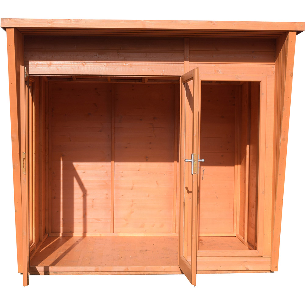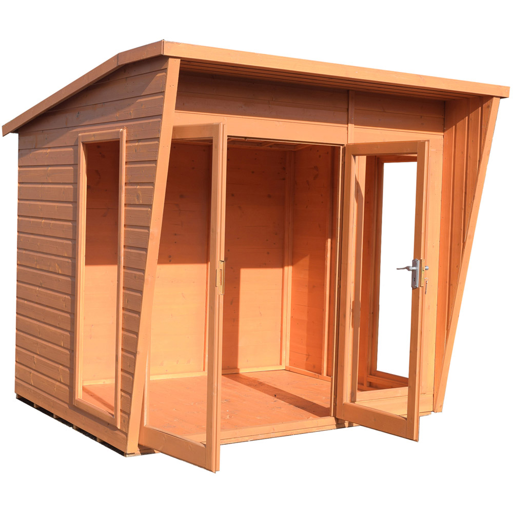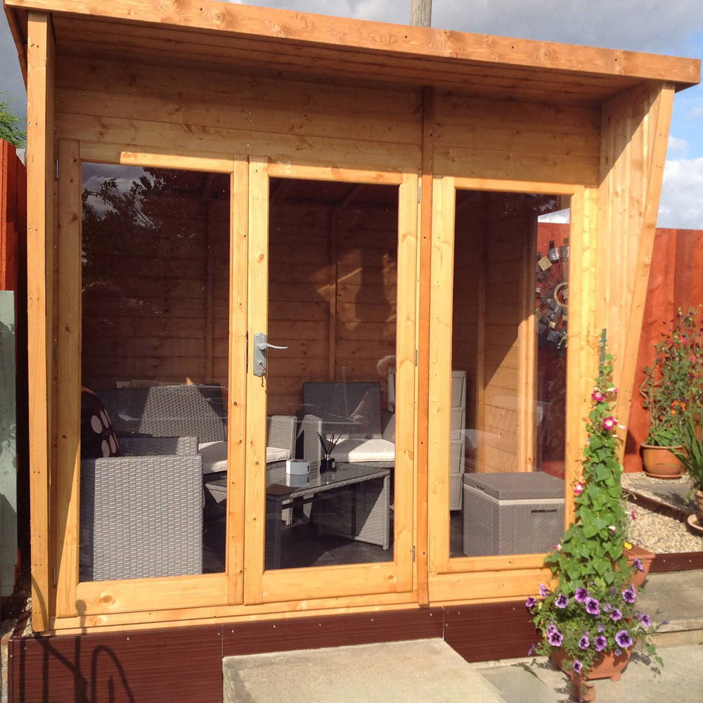 The contemporary Highclere Summerhouse is a stunning design updating the traditional summerhouse into a modern garden room. The high quality double doors open out to the front with a small canopy over and there are large side windows. The windows and doors are fitted with acrylic safety glazing and are joinery made in a storm resistant design. The doors are also fitted with a mortice lock. The building is constructed on strong 34mm square framing and clad with planed shiplap tongue and groove boards made only from the highest grade, slow grown, FSC approved, northern European pine. The roof is 12mm plywood sheet with mineral roof felt supplied to complete the exterior and the floor is T&G. Dipped base coat preservative ready for you to top coat. Note: Currently, we're unable to deliver this product to DG, TD, KA, ML, EH, G, PA, FK, KY, PH, DD, AB IV and KW areas. We regret the inconvenience and will keep you posted when it's available to order for the mentioned postcodes.