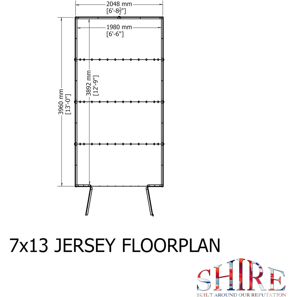 Store all your garden equipment and bulky machinery safely and securely with Shire Jersey Wooden Shed 7 x 13ft. Ideal for those needing loads of storage or workshop space - it comes with three large openings, joinery quality, storm resistant, windows and wide double doors for easy access. This shed has been dip treated to provide extra protection and ensure its longevity. With its spacious interior, this building is ideal for larger gardens and the 12mm cladding contributes to the building's strength and durability. Finished with a honey-brown basecoat preservative treatment it is ready for top coating for your choice after assembly. Roof felt fixings and assembly instructions are included.Note: Currently, we're unable to deliver this product to DG, TD, KA, ML, EH, G, PA, FK, KY, PH, DD, AB IV and KW areas. We regret the inconvenience and will keep you posted when it's available to order for the mentioned postcodes.