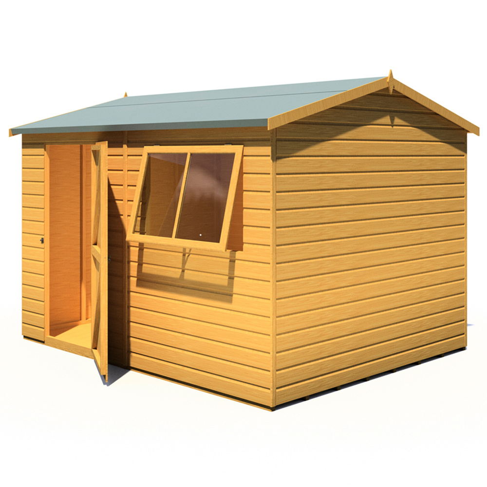 This handmade 10 x 8ft Lewis Style D Reverse Apex Shed from Shire is a garden classic, essential for all homes. With a good eaves height, this building is ideal as a workshop as well as storage. The shed is supplied with top-quality 12mm Shiplap timber to the walls, roof and floor, all on sturdy 34 mm square framing. The door comes with a full-length security hinge and the pad bolt and windows are fixed. Its door and window frames are pre-hung for easy assembly and feature a high standard of traditional joinery. The shed comes with a base coat preservative ready for you to top coat after assembly. Mineral roof felt and all necessary fixings are supplied and the shed comes flat-packed with a full set of installation instructions. The dimensions shown are for the exterior wall of the building. (Imperial measurements are rounded so please refer to the metric sizes for accuracy). Before you assemble your building, you will need a base which is flat and level to a sufficient size. Grass, soil or gravel are not sufficient as they will move with the weight of a building.Note: Currently, we're unable to deliver this product to DG, TD, KA, ML, EH, G, PA, FK, KY, PH, DD, AB IV and KW areas. We regret the inconvenience and will keep you posted when it's available to order for the mentioned postcodes.