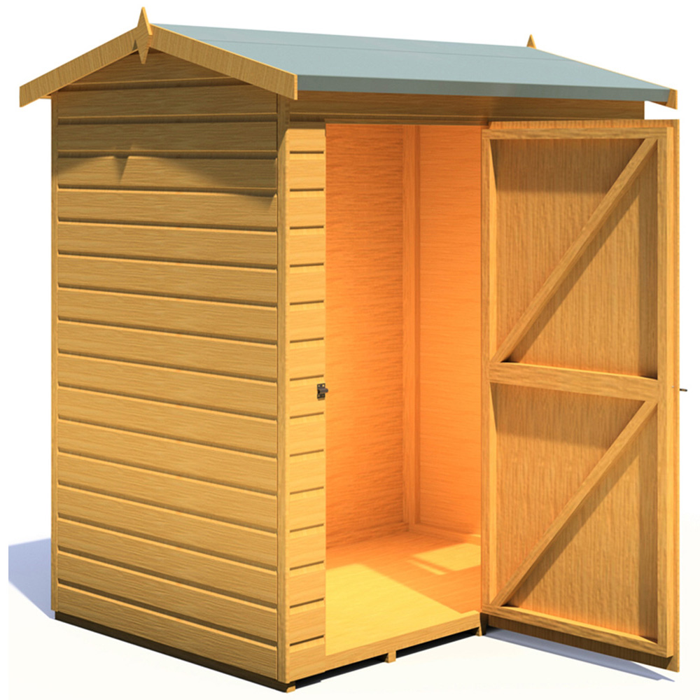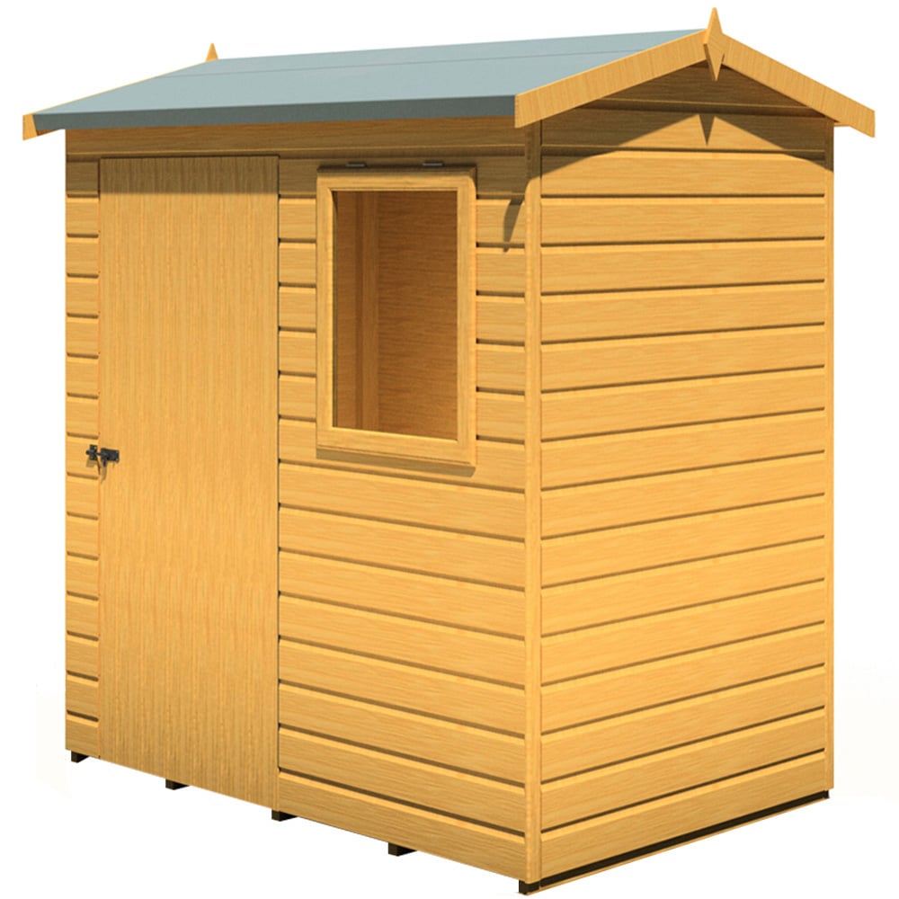 This handmade 6 x 4ft Lewis Style D Reverse Apex Shed from Shire is a garden classic, essential for all homes. With a good eaves height, this building is ideal as a workshop as well as storage. The shed is supplied with top-quality 12mm Shiplap timber to the walls, roof and floor, all on sturdy 34 mm square framing. The door comes with a full-length security hinge and the pad bolt and windows are fixed. Its door and window frames are pre-hung for easy assembly and feature a high standard of traditional joinery. The shed comes with a base coat preservative ready for you to top coat after assembly. Mineral roof felt and all necessary fixings are supplied and the shed comes flat-packed with a full set of installation instructions. The dimensions shown are for the exterior wall of the building. (Imperial measurements are rounded so please refer to the metric sizes for accuracy). Before you assemble your building, you will need a base which is flat and level to a sufficient size. Grass, soil or gravel are not sufficient as they will move with the weight of a building.Note: Currently, we're unable to deliver this product to DG, TD, KA, ML, EH, G, PA, FK, KY, PH, DD, AB IV and KW areas. We regret the inconvenience and will keep you posted when it's available to order for the mentioned postcodes.