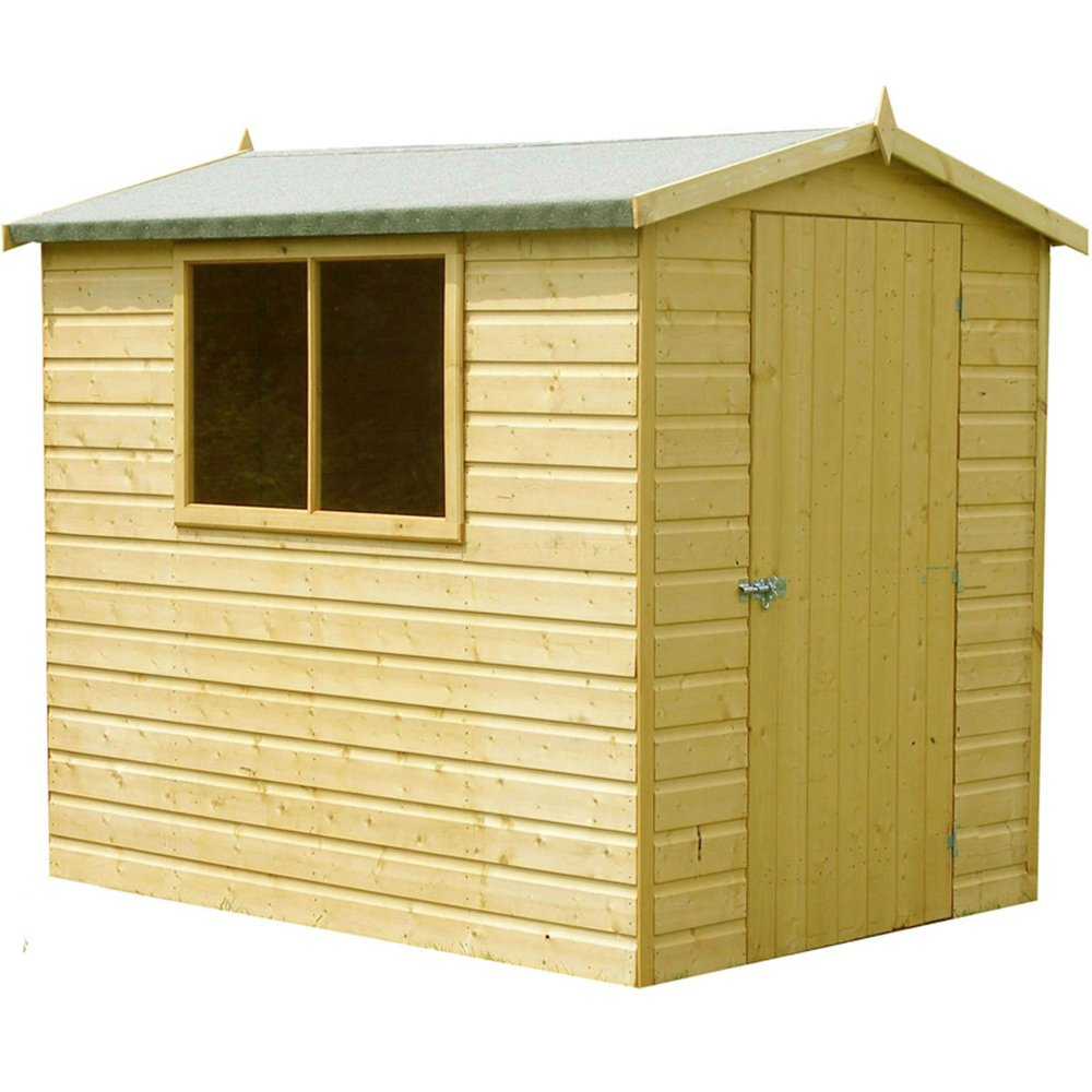Keep all your garden equipment and tools safe and secure with Shire Lewis Shed 7 x 5ft. The shed is supplied with top-quality 12mm Shiplap timber to the walls, roof and floor, all on sturdy 34mm square framing. It features a full-length door secured with hinges and fixed windows. Doors and window frames are pre-hung for easy assembly and the door can go at either end. The shed comes with a base coat preservative ready for you to top coat after assembly. Roof felt fixings and assembly instructions are included.Note: Currently, we're unable to deliver this product to DG, TD, KA, ML, EH, G, PA, FK, KY, PH, DD, AB IV and KW areas. We regret the inconvenience and will keep you posted when it's available to order for the mentioned postcodes.