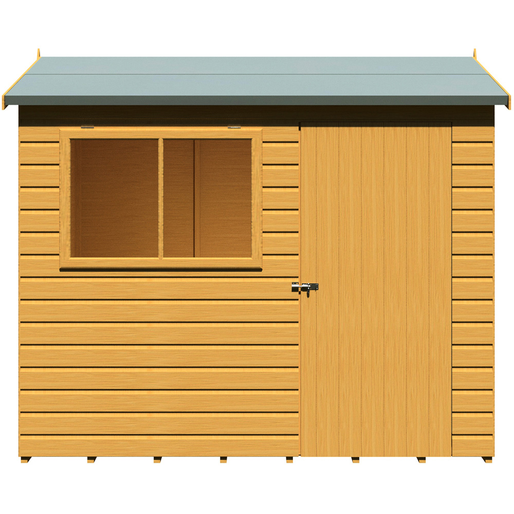 This handmade 8 x 6ft Lewis Style C Reverse Apex Shed from Shire is a garden classic, essential for all homes. With a good eaves height, this building is ideal as a workshop as well as storage. The shed is supplied with top-quality 12mm Shiplap timber to the walls, roof and floor, all on sturdy 34 mm square framing. The door comes with a full-length security hinge and the pad bolt and windows are fixed. Its door and window frames are pre-hung for easy assembly and feature a high standard of traditional joinery. The shed comes with a base coat preservative ready for you to top coat after assembly. Mineral roof felt and all necessary fixings are supplied and the shed comes flat-packed with a full set of installation instructions. The dimensions shown are for the exterior wall of the building. (Imperial measurements are rounded so please refer to the metric sizes for accuracy). Before you assemble your building, you will need a base which is flat and level to a sufficient size. Grass, soil or gravel are not sufficient as they will move with the weight of a building.Note: Currently, we're unable to deliver this product to DG, TD, KA, ML, EH, G, PA, FK, KY, PH, DD, AB IV and KW areas. We regret the inconvenience and will keep you posted when it's available to order for the mentioned postcodes.
