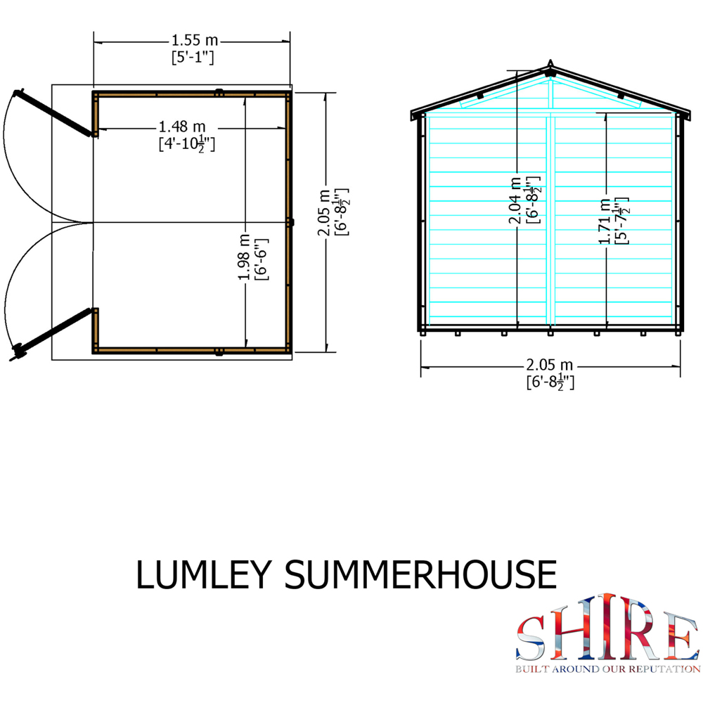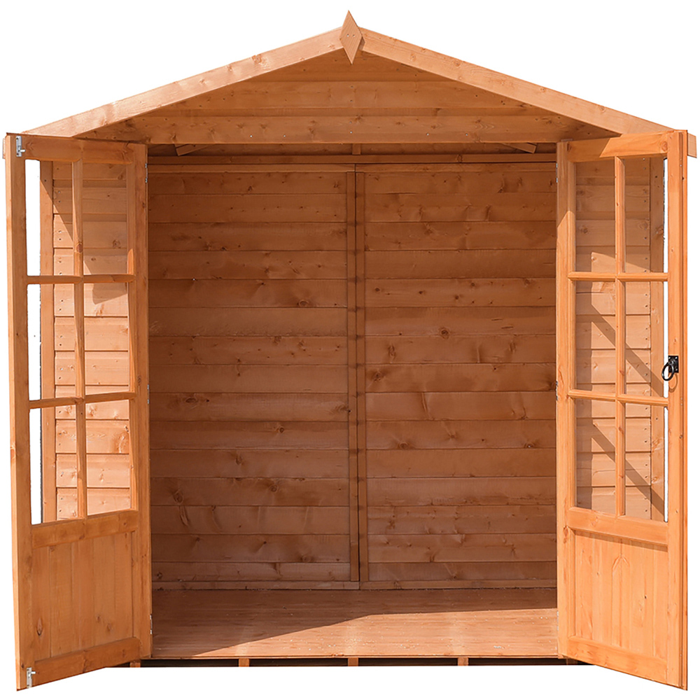 Add an attractive addition to the garden with Shire 7 x 5ft Lumley Summerhouse. This versatile building is suitable as a summer house, hobby room or to store your garden furniture. The practical, joinery quality, glazed double doors with a large canopy make this a welcome addition to any garden or patio. It is constructed on sturdy 34mm square framing and clad with planed shiplap tongue and groove boards. Made from the highest grade, FSC-approved slow-grown northern European pine. The floor is tongue and groove and the roof is solid sheet OSB. It is treated with a dip-treated honey brown base coat preservative ready for you to top coat immediately after installation.