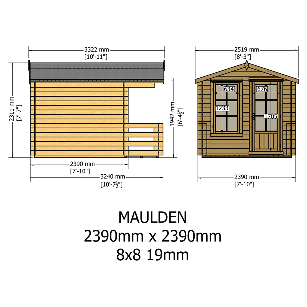 Complete your outdoors with the Shire 8 x 8 feet Maulden Log Cabin Shed. The shed makes an attractive addition to any garden because of its high-quality Georgian window and door together with a decked terrace. This top-quality log cabin features 19mm interlocking high-grade pine boards to the walls along with tongue and groove for reliable construction.Note: Currently, we're unable to deliver this product to DG, TD, KA, ML, EH, G, PA, FK, KY, PH, DD, AB IV and KW areas. We regret the inconvenience and will keep you posted when it's available to order for the mentioned postcodes.