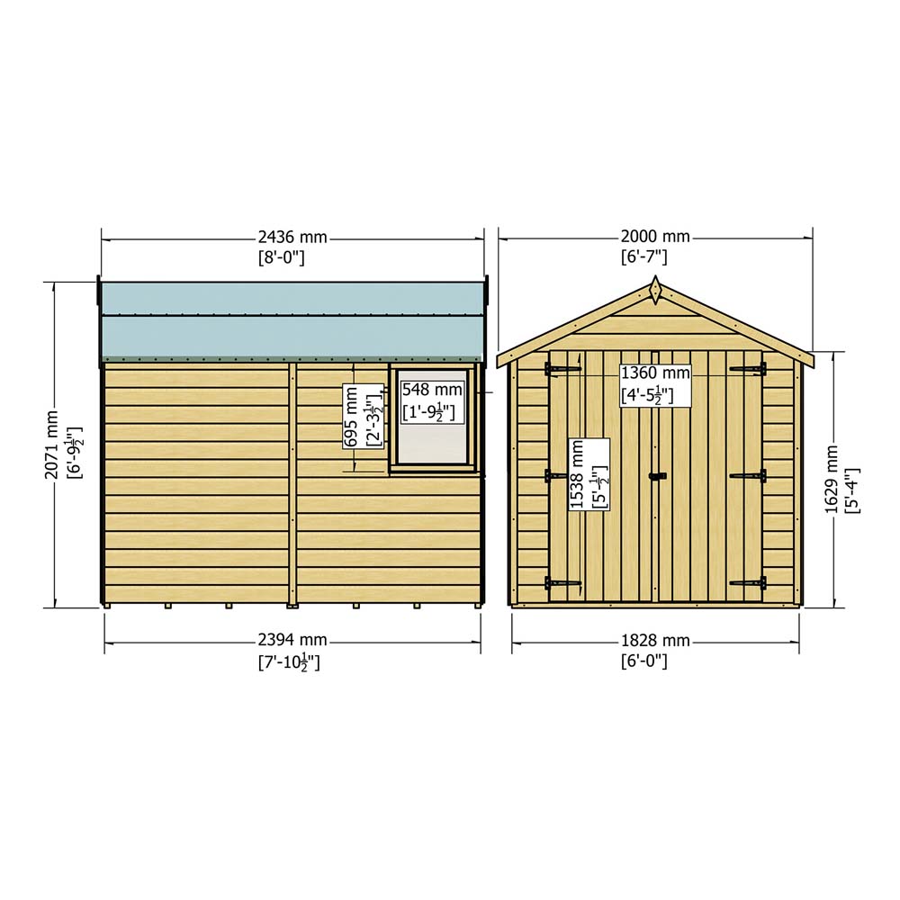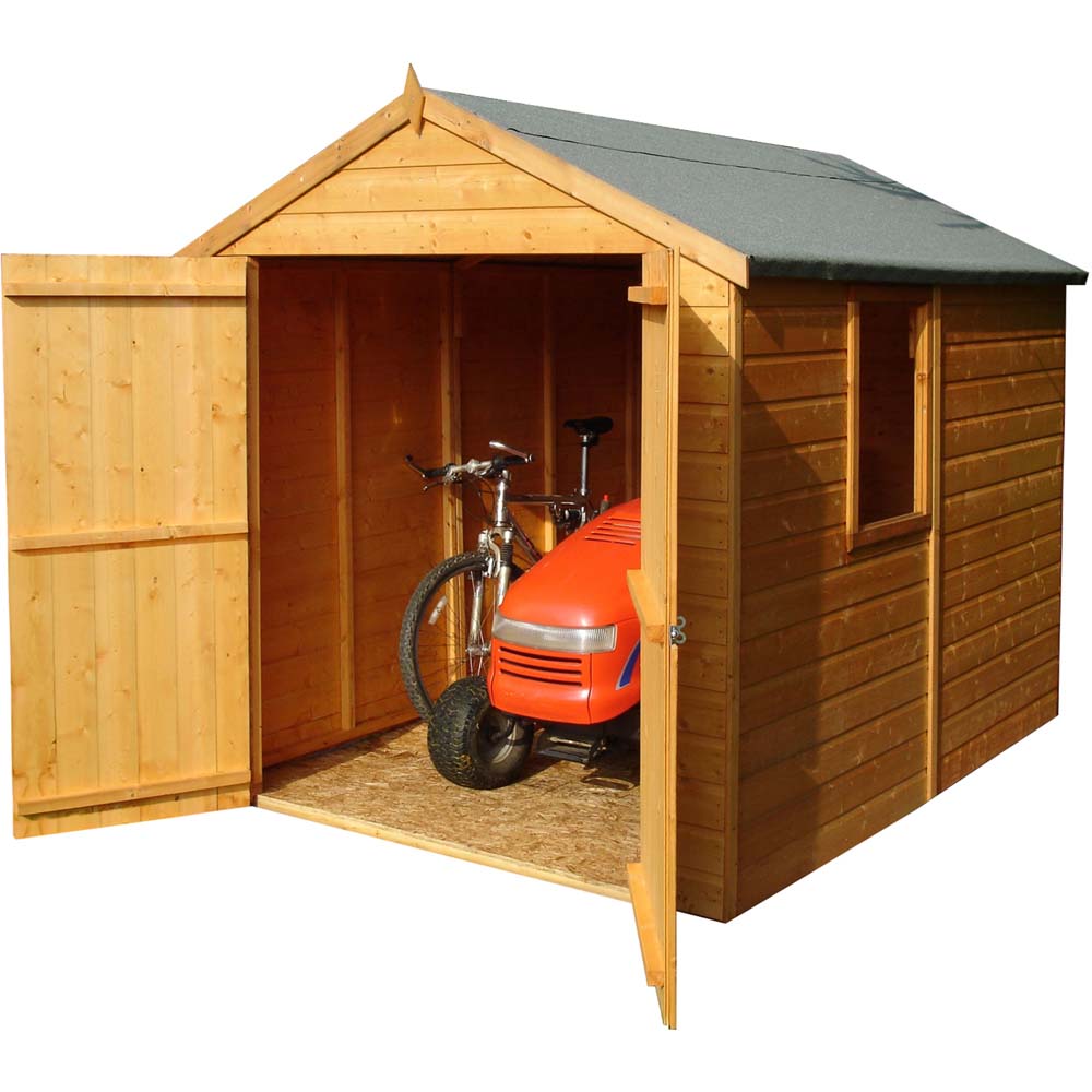 The British manufactured Warwick 8 x 6ft Double Door Wooden Shed is superb value for money. This spacious shed is supplied with top quality 12mm Shiplap timber to the walls and solid OSB boards to the roof and floor on 34mm square framing. It comes one opening window, roof felt and all necessary fixings and is flat packed with a full set of installation instructions. Manufactured from High Northern European FSC certified timber and finished with a honey brown basecoat preservative treatment ready for you to top coat following assembly. Dimensions shown are for the exterior wall of the building (Imperial measurements are rounded so please refer to the metric sizes for accuracy).Note: Currently, we're unable to deliver this product to DG, TD, KA, ML, EH, G, PA, FK, KY, PH, DD, AB IV and KW areas. We regret the inconvenience and will keep you posted when it's available to order for the mentioned postcodes.