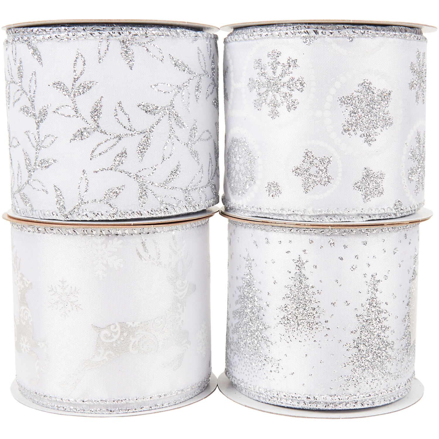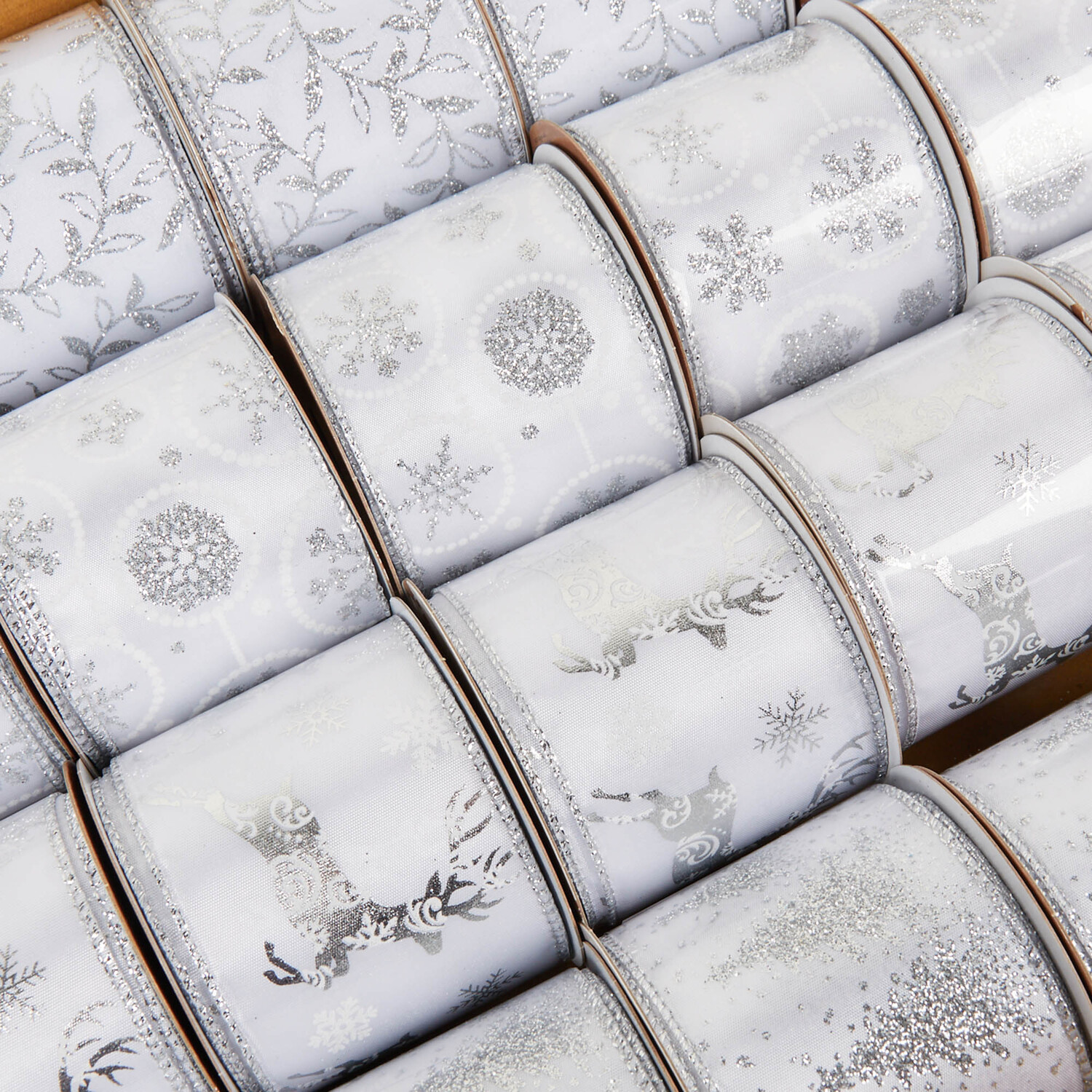 Add an elegant finishing touch to your presents with the Silver or White Premium Ribbon. Featuring a captivating silver or white colourway, this ribbon is designed with intricate patterns and glitter embellishments to give it a mesmerising festive look. Available in an assortment of eye-catching styles, this ribbon is perfect for layering up your gifts so you can share the joy of Christmas with your friends and family.