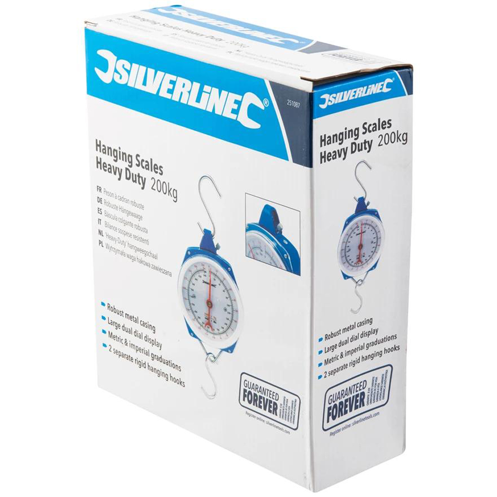 This Silverline Heavy Duty Hanging Scale is ideal for weighing heavy loads up to 200kg. It features a robust metal casing for durability in tough environments and a large dual dial display with clear metric and imperial graduations for easy reading. Equipped with two separate rigid hanging hooks, this scale ensures secure and stable load handling—perfect for workshops, warehouses, and outdoor use.