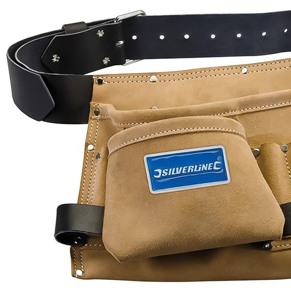 Stay organised with the Silverline Leather Tool Bag, crafted from heavy-duty split suede leather for durability and comfort. Featuring eight spacious pockets, two hammer loops, a plier pouch, and a tape holder, this tool bag keeps all your essentials within easy reach. The fully adjustable leather belt ensures a secure and comfortable fit, making it perfect for professionals and DIYers alike.