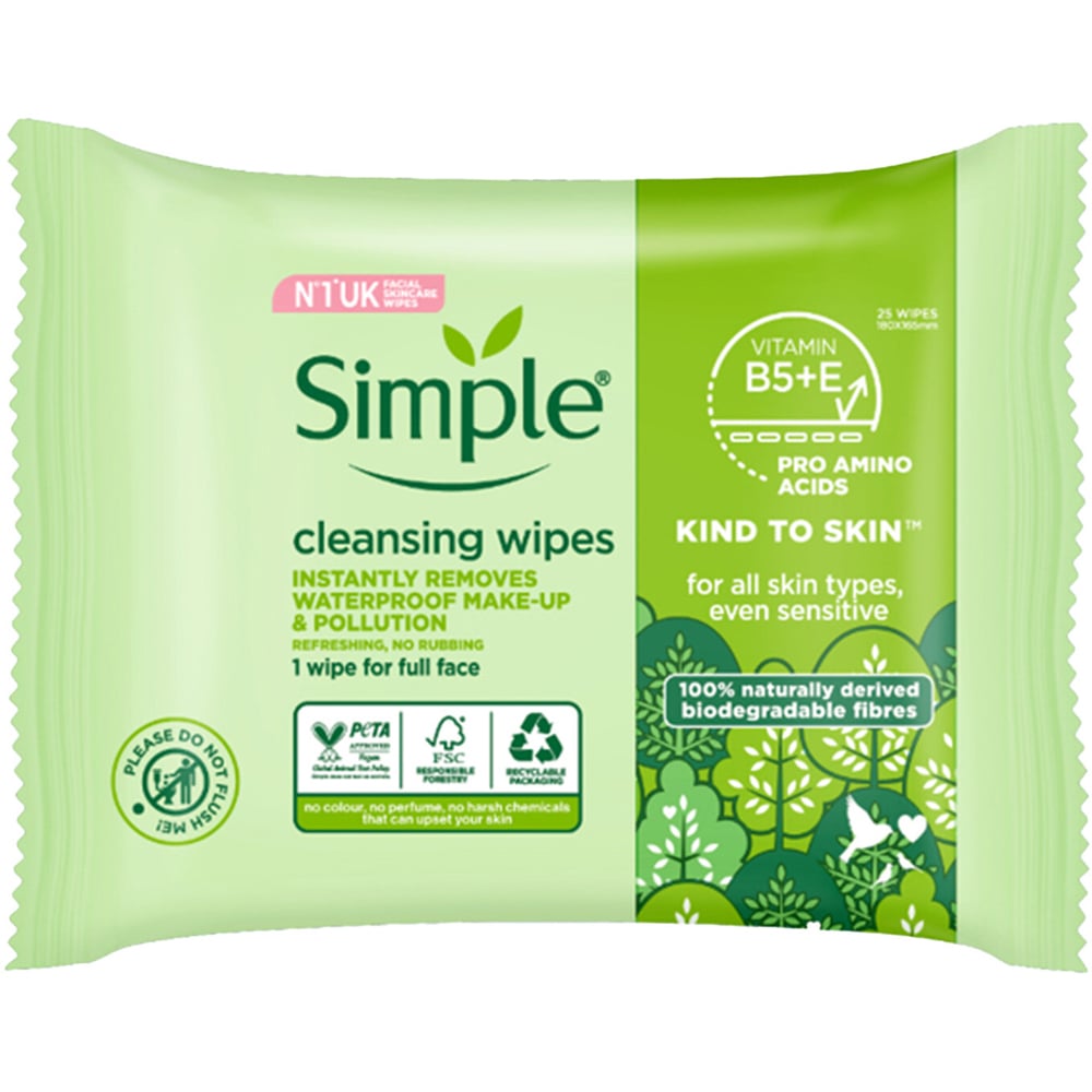Effortlessly remove waterproof makeup and pollution without harsh scrubbing using Simple Cleansing Wipes. Perfect for sensitive skin, these wipes contain no colour, perfume, or harsh chemicals. Suitable for all skin types, they are enriched with vitamins B5 and E to nourish your skin and are made from naturally derived, biodegradable fibres. Pack of 25.