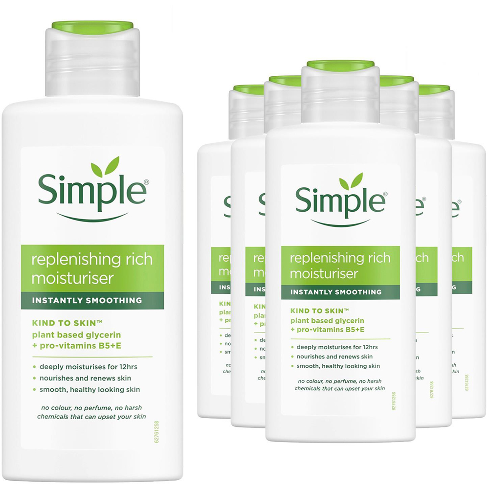 Dry skin? Start your day with the Simple Kind to Skin Replenishing Rich Moisturiser. This product is ideal for when your skin needs a hydration boost and is perfect to use both morning and evening to help keep your skin replenished and nourished for up to 24 hours. Featuring our special blend of Simple hydrating goodness, containing pro-vitamin B5, Glycerin, and Bisabolol, this skincare essential helps to hydrate, soften and nourish dry skin. Give your skin a bit of TLC! As we know how important it is for your skin to look and feel its best, our products contain no artificial perfumes or colours, and no harsh chemicals that can upset your skin. Leaving your skin feeling smooth, soft, and nourished for up to 24 hours. Infused with skin-loving ingredients such as Glycerin, Bisabolol, and Pro-Vitamin B5. Dermatologically tested and approved. This cream is hypoallergenic, non-comedogenic (it doesn't clog pores). Contains no artificial perfumes or colours, no alcohol, and no harsh chemicals. Vegan and Simple is certified cruelty-free by PETA. Ingredients: Aqua, Glycerin, Coco-Caprylate Caprate, Polyglyceryl-3 Methylglucose Distearate, Ethylhexyl Methoxycinnamate, Stearyl Alcohol, BHT, Bisabolol, Butyl Methoxydibenzoylmethane, C13-14 Isoparaffin, Caprylyl Glycol, Disodium EDTA, Lactic Acid, Laureth-7, Panthenol, Pantolactone, Pentylene Glycol, Phenoxyethanol, Polyacrylamide, Serine, Sodium Hydroxide, Sodium Lactate, Sorbitol, Stearic Acid, Tocopheryl Acetate, Urea. Preparation and Usage: Apply in the morning or evening on the face and neck. Avoid direct contact with the eyes. For best results, apply after using our facial cleanser. Box Contains: Six packs of Simple Kind to Skin Replenishing Rich Moisturiser, 125 ml.