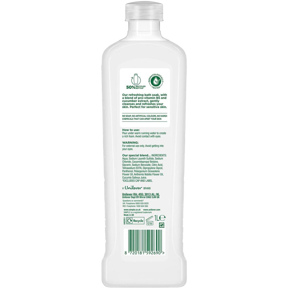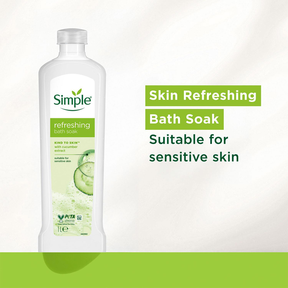 Smile, its simple. Simple has been the expert in sensitive skin care since launching the first perfume and colour-free soap in 1960. Simple says no to artificial perfumes, colours and harsh chemicals that can upset your skin. Choose Simple Kind to Skin Refreshing Bath Soak to cleanse and refresh your skin. Free from soap, artificial colours and harsh chemicals, this bath product contains a gentle blend of pro-vitamin B5 and cucumber extract. The bath soaks are suitable for even the most sensitive skin. How to use: Pour Simple Kind to Skin Refreshing Bath Soak under warm running water to create a rich foam. Avoid contact with eyes. Pack of 3.