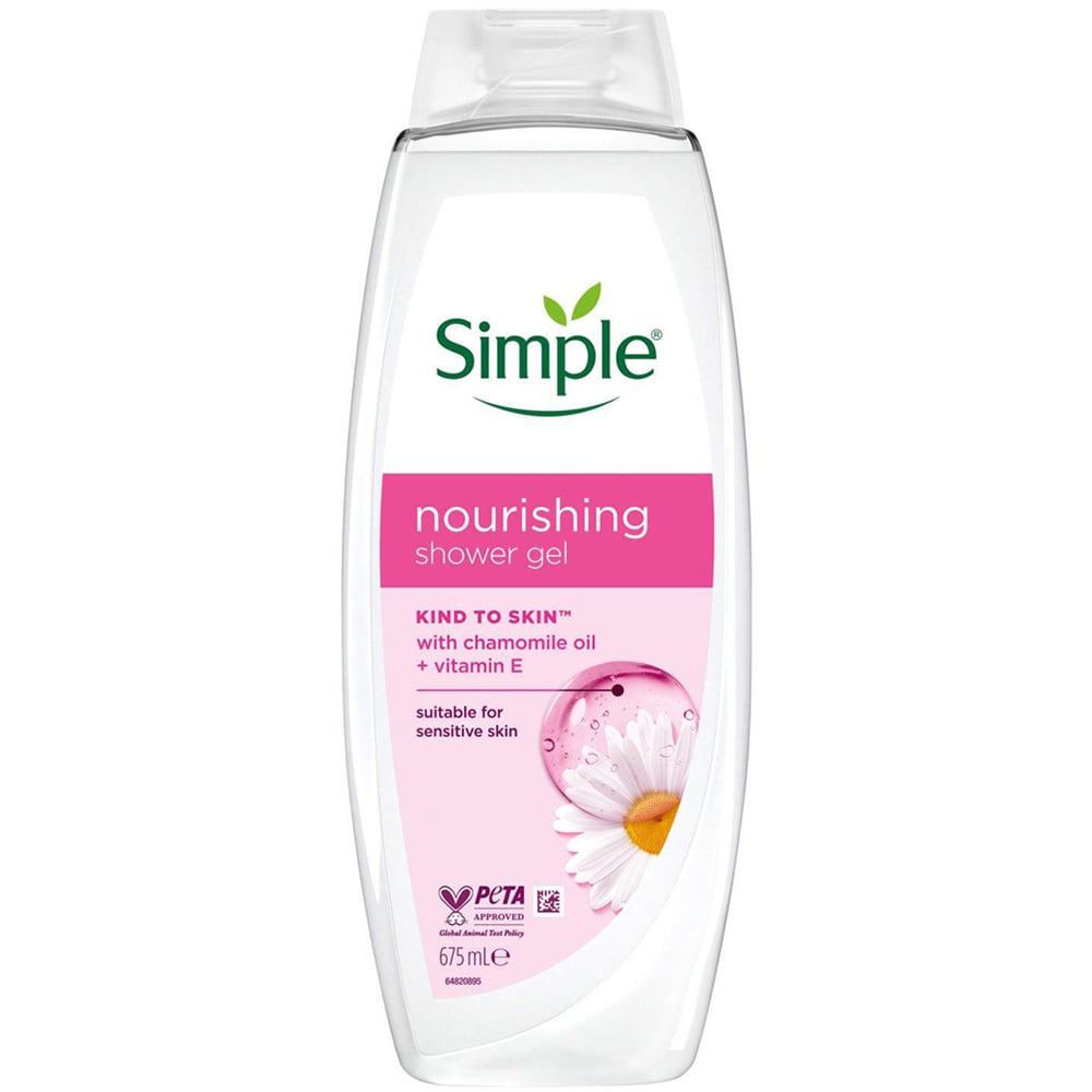 Simple Kind to Skin Nourishing Shower Cream gently cleanses, moisturises, and soothes your skin. The shower cream is kind to the skin and perfect for daily use on all skin types. Made with skin-loving ingredients, this body wash is infused with vitamin E, pro-vitamin B5, chamomile oil, and natural geranium oil to ensure excellent skin care. Dermatologically tested and approved, our natural shower gel is a cleansing essential for dry and sensitive skin. Its gentle formula is free from artificial perfume, colour, soap, animal-derived ingredients or harsh chemicals that can upset your skin. Simple's natural body wash includes the perfect blend of ingredients to awaken and revitalise your skin. How to use: Squeeze onto a sponge or your hands. Gently massage over your skin to form a rich lather. Rinse thoroughly. Avoid contact with the eyes. Simple is also kind to the environment it is certified Cruelty-Free by PETA and Nourishing Shower Cream comes in recyclable packaging. Pack of 3.