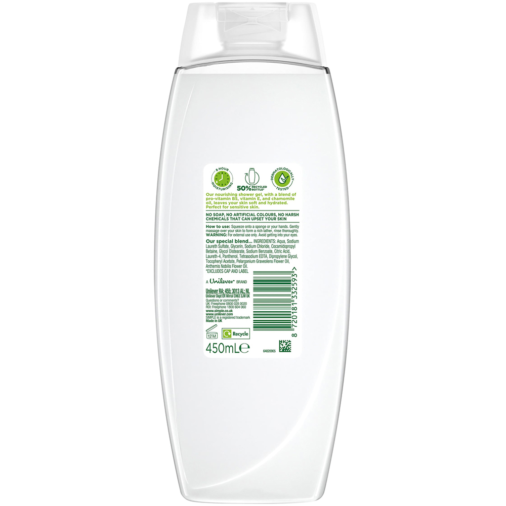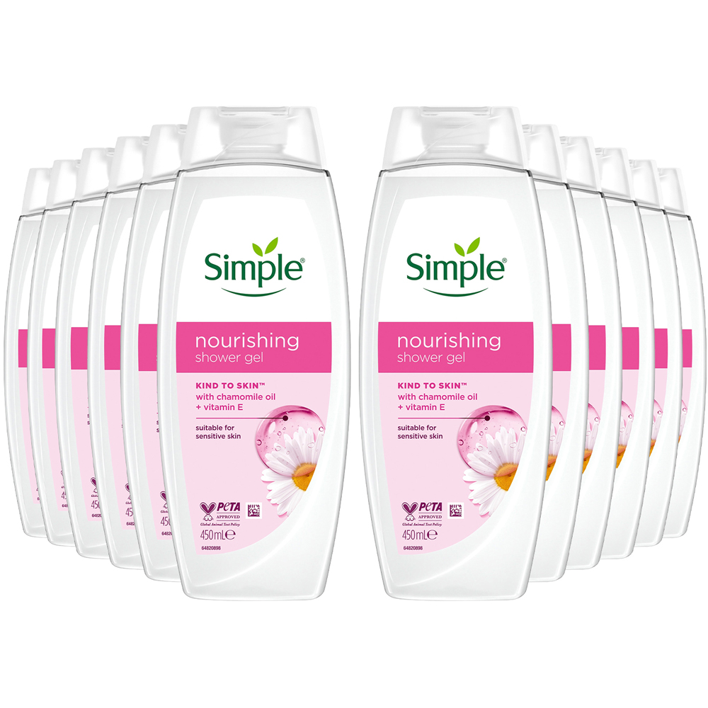 Simple Kind to Skin Nourishing Shower Cream gently cleanses, moisturises, and soothes your skin. This shower cream is kind to the skin and perfect for daily use on all skin types. Made with skin-loving ingredients, this body wash is infused with vitamin E, pro-vitamin B5, chamomile oil, and natural geranium oil to ensure excellent skin care. Dermatologically tested and approved, our natural shower cream is a cleansing essential for dry and sensitive skin. Simple has been the expert in sensitive skin since launching the first perfume and colour-free soap in 1960. This moisturising body wash is suitable for all skin types, even the most sensitive skin. The Nourishing Shower Cream is infused with vitamins E, and B5 and natural geranium oil for gentle cleansing and skin care. This nourishing shower cream is dermatologically tested and approved, so we can ensure it's gentle on all skin types. How to Use: Squeeze onto a sponge or your hands. Gently massage over your skin to form a rich lather. Rinse thoroughly. Ingredients: Aqua, Sodium Laureth Sulfate, Glycerin, Sodium Chloride, Cocamidopropyl Betaine, Sodium Benzoate, Citric Acid, Glycol Distearate, Laureth-4, Sodium Lactate, Panthenol, Hydrolysed Wheat Protein, Tetrasodium EDTA, Bisabolol, Dipropylene Glycol, Tocopheryl Acetate, Pelargonium Graveolens Flower Oil, Anthemis Nobilis Flower Oil. Pack of 12.