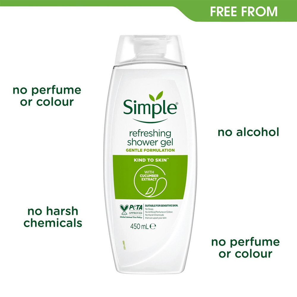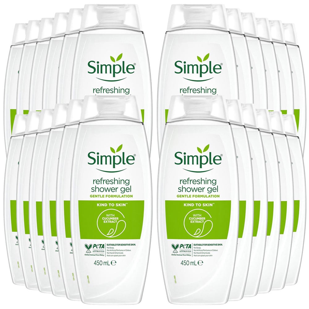 Smile, it's simple. Simple has been the expert in sensitive skin since launching the first perfume and colour-free soap in 1960. A refreshing shower gel for dry skin with cucumber extracts and pro-vitamin B5, but no artificial perfume or colour, and no harsh chemicals that can upset your skin. Simple's luxury shower gel is a perfect blend of ingredients to awaken and revitalise your skin. This body wash has been dermatologically tested and approved, and therefore, it is an excellent shower gel for dry or sensitive skin. It is the perfect blend of ingredients to clean and energise your skin. Simple's sensitive skin experts created a shower gel that is perfect for even the most sensitive skin. The shower gel is enriched with cucumber extracts and pro-vitamin B5. This body wash contains no artificial perfume, colour, or harsh chemicals that can upset your skin. This shower gel for dry skin is dermatologically tested and approved. How to Use: Squeeze sensitive body wash onto a sponge or your hands. Gently massage over your skin to form a rich lather. Rinse thoroughly. Ingredients: Aqua, Sodium Laureth Sulfate, Sodium Chloride, Cocamidopropyl Betaine, Glycerin, Sodium Benzoate, Citric Acid, Sodium Lactate, Polyquaternium-7, Panthenol, Tetrasodium EDTA, Menthyl Lactate, Dipropylene Glycol, Propanediol, Cucumis Sativus Fruit Extract. Pack of 24.