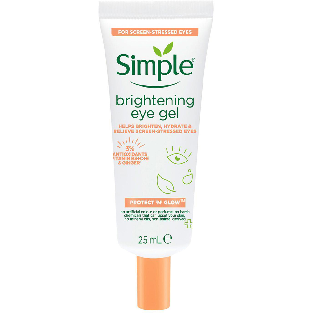 Simple Protect N Glow Brightening Eye Gel for Screen-stressed Tired eyes - 25ml Boost the hydration levels of and brighten your eyes with Simple Protect 'n' Glow Brightening Eye Gel. Specially designed to give your hard-working, screen-stressed eyes the hydration and brightness they deserve. Its lightweight, fast-absorbing gel formula instantly helps to visibly reduce dark circles and provides antioxidant benefits. This eye gel with a lightweight cooling gel texture is made with 5% hydrating actives, 3% antioxidants, vitamins B3, C and E, ginger, and minerals - the perfect combination of skin-loving ingredients, minerals and plant extracts that are gentle and kind to skin, making it perfect for all skin types, even for sensitive skin. It has been dermatologically and ophthalmologically tested so you can use it worry-free. The eye gel contains no skin-harmful ingredients like artificial perfumes, colours, alcohol, mineral oils or harsh chemicals that could lead to skin irritation. It is vegan and certified cruelty-free by PETA. Features: Simple Protect 'n' Glow Brightening Eye Gel provides eye care for tired eyes exposed to blue light from screens. It instantly hydrates and brightens your eye area, complementing your skincare routine. Simple eye gel visibly reduces dark circles and relieves screen-stressed eyes. The presence of alfalfa in the eye gel gives your skin antioxidant protection to fight against blue light. The eye gel contains no artificial colours or perfumes, no harsh chemicals, no alcohol, no mineral oils, and is non-animal derived. How to Use: Three ways to use the Brightening Eye Gel In the morning: as a brightening gel. Store in the refrigerator for even better results. Before applying make-up: as a hydrating primer During the day: as a soothing treatment for tired eyes (Simple tip: try applying a teeny-tiny bit directly on the eyelids) Ingredients: Aqua, Propanediol, Niacinamide, Glycerin, Tetrahydroxypropyl Ethylenediamine, Caprylyl Glycol, Phenoxyethanol, Carbomer, Saccharide Isomerate, Citric Acid, Hydrolyzed Lupine Protein, Disodium EDTA, Medicago Sativa Seed Extract, Tocopheryl Acetate, Sodium Ascorbyl Phosphate, Sodium Citrate, Ethylhexylglycerin, Zingiber Officinale Root Juice Package Includes: Simple Protect N Glow Brightening Eye Gel - 25ml.