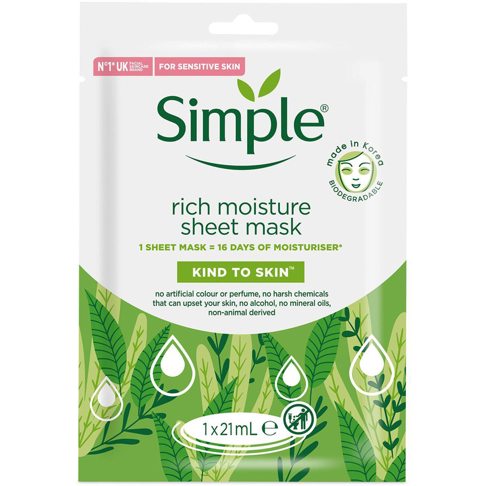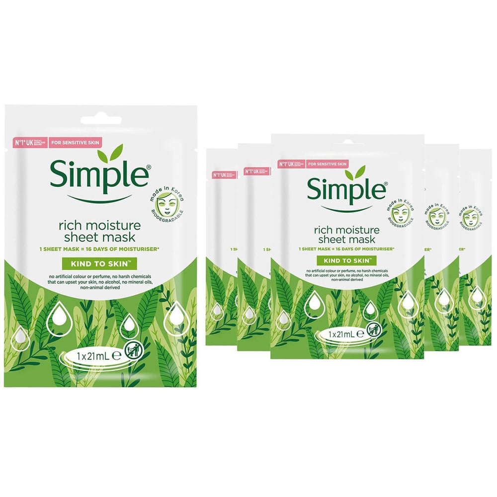 This vitamin-enriched sheet mask infuses active nutrients into the skin to minimise the drying effect of pollution and instantly hydrate skin. The rich moisture face mask does not contain unnecessary ingredients like perfumes, colour or dye, and harsh chemicals that could lead to skin irritation. Perfect for even sensitive skin. Convenient and easy to use on the go. The perfect antidote for dry city skin. Simple's new kind to skin sheet mask is made of natural fibres. So light and soft that it contours the face like a second skin. Enriched with a blend of botanical extracts and moisturising ingredients. It infuses active nutrients into the skin to condition dry, dehydrated skin. How to use: Remove the mask from the sachet and gently unfold. Place the mask evenly over your previously cleansed skin. Leave for 15 minutes and gently peel off the mask. Massage to absorb the excess product into your skin, or use a cotton pad to remove. No need to rinse. Ingredients: Aqua, Glycerine, Dipropylene Glycol, Chondrus Crispus Powder, Adenosine, Cellulose Gum, Ceratonia Siliqua Gum, Chlorella Vulgaris Extract, Chlorphenesin, Citrus Limon Fruit Extract, Citrus Nobilis Peel Extract, Dextrin, Disodium EDTA, Glucomannan, Lactobacillus or Punica Granatum Fruit Ferment Extract, Leuconostoc or Radish Root Ferment Filtrate, Niacinamide, Phenoxyethanol, Potassium Chloride, Xanthan Gum. Pack of 6.