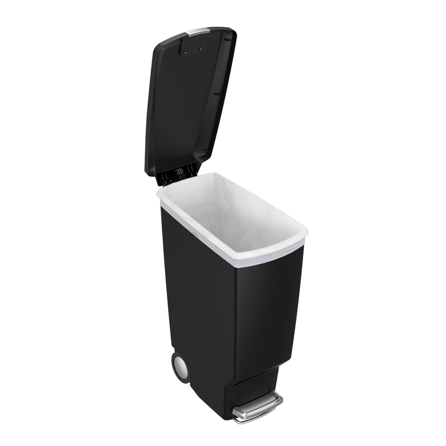 The simplehuman 40L slim pedal bin plastic has a space-efficient shape that fits perfectly in tight spaces, like between cabinets. The strong steel pedal is designed to last, and our patented lid shox technology ensures a smooth, silent close every time. A slide lock helps keep rubbish in and pets and curious children out. The simplehuman code K liner fits this bin perfectly – no bunching or slipping for a cleaner experience.
