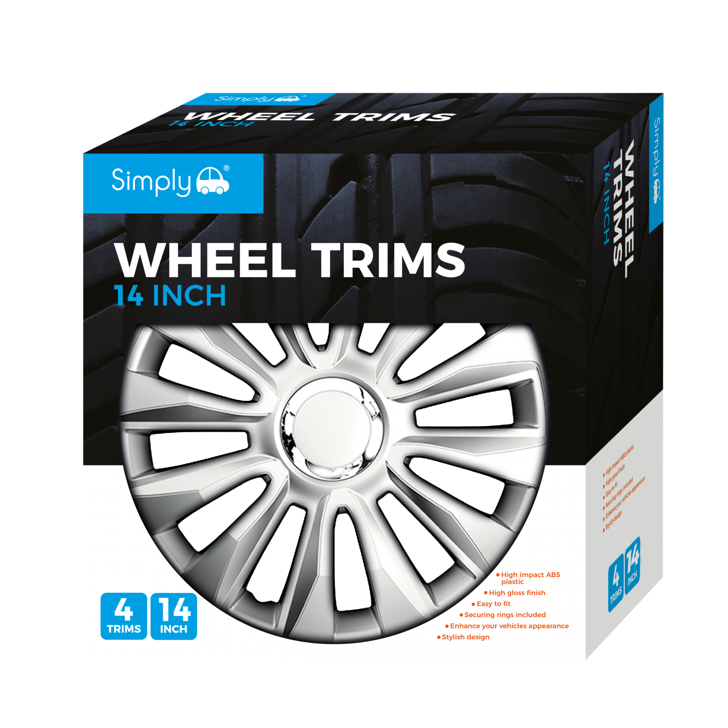 These Simply Auto Wheel Trims 14inch are manufactured from high-impact ABS plastic with a high gloss finish. This not only makes them rust-proof but also beneficially corrosion-resistant and durable. These premium quality trims are designed to withstand high braking temperatures and brake dust build-up for longer life. Make your car look brand new with a set of these easy-to-fit stylish wheel trims.