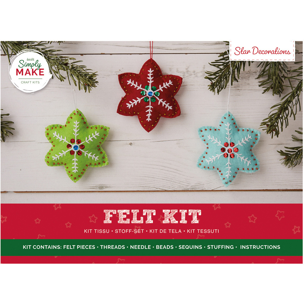 Bring a unique touch to your home décor with the Simply Make Star Felt Ornament Kit 3 Pack. This delightful kit contains everything you need to create your own felt masterpiece. Inside the kit, you'll find felt pieces, sequins, beads, stuffing, a needle, thread, and string. With these high-quality materials and easy-to-follow instructions, creating your very own felt centrepiece is simple and enjoyable.