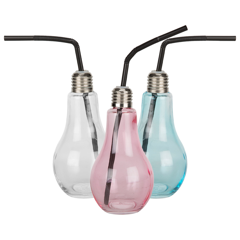 Serve your drinks with an exciting twist! Perfect for cocktails, soft drinks, milkshakes and more, this quirky Bulb Glass will transform your drinking experience. The aluminium screw top lid will hold a straw, while the flat bottom will ensure the glass stands up right. These glasses will prove to be a bright idea for your next party or get-together. Available in blue, pink and clear.