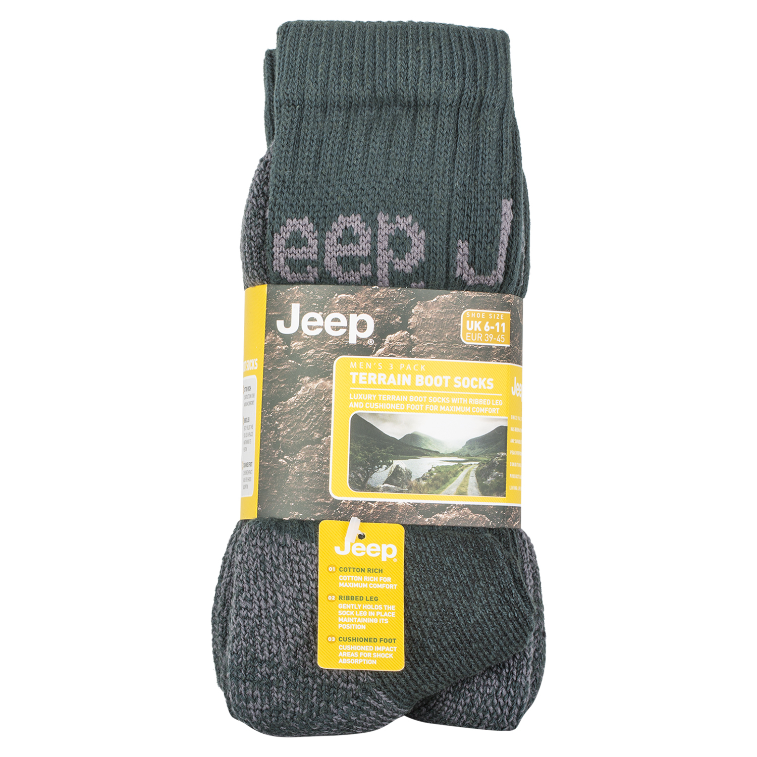 The Jeep Mens Black Terrain Socks 3 Pack is the ideal pack of socks for any occasion, be it a brisk walk across winter moorland or just cuddling up on the sofa and enjoying a cup of tea - with maximum comfort and warmth, these socks won't let you down!