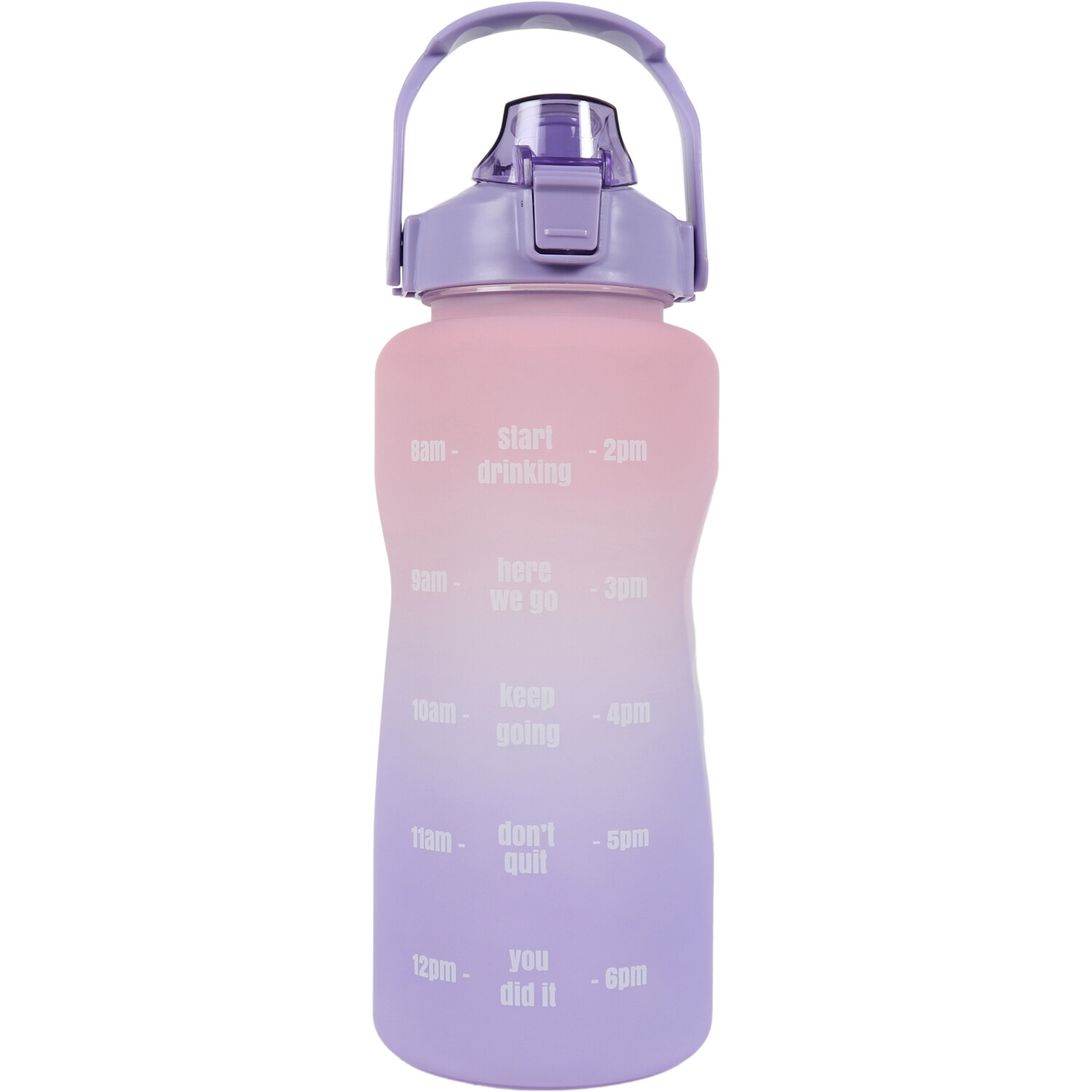 The 2L jumbo ombre water bottle is available in two colours and features a handy tracker to ensure you drink enough water throughout the day. The sports bottle has a convenient carry handle and a flip-up drinking nozzle for easy carrying and drinking. The large capacity is perfect for use on the go for fewer refills throughout the day.