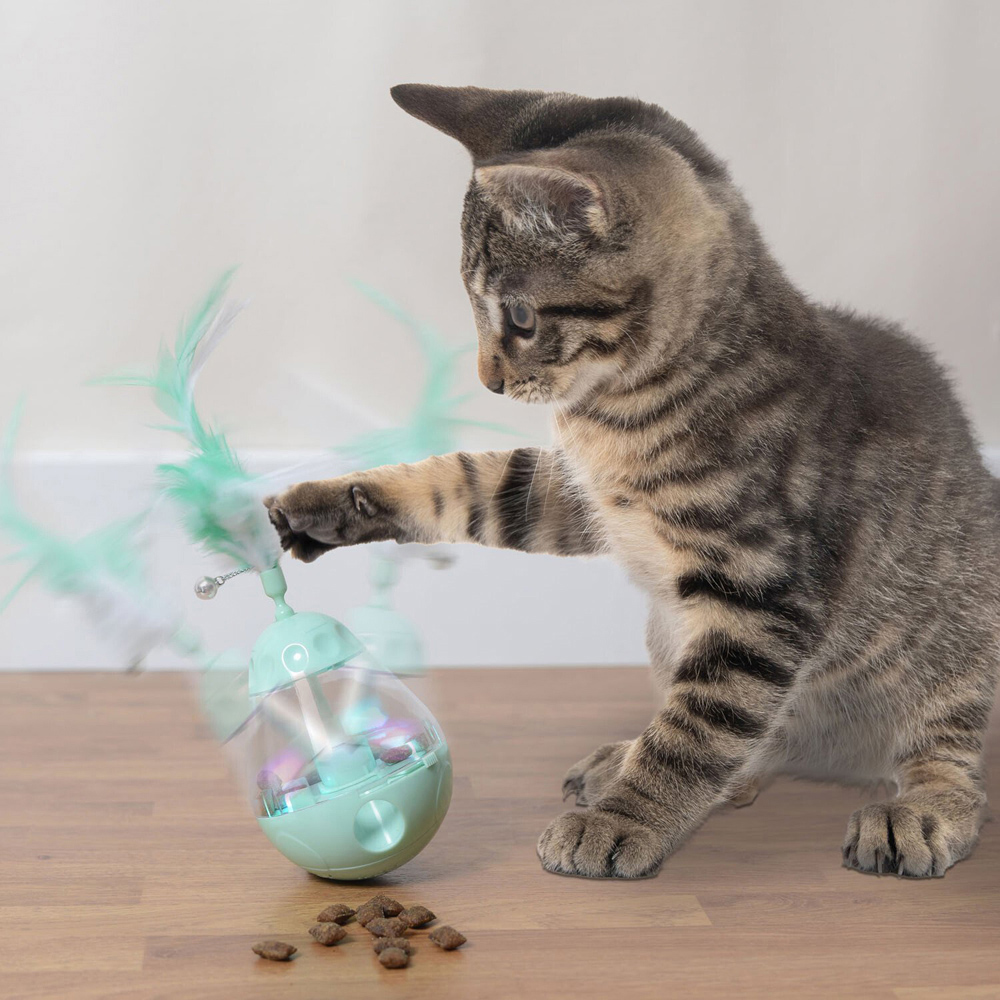 Keep your furry friend entertained for hours with this Turquoise Wobbler Treat Dispenser Cat Toy. This electronic treat dispenser wobbles and spins to give your cat hours of fun, dispensing tasty snacks as they play. The flashing lights, feathers and the bell are sure to entice your kitty into playing, As this toy rolls around, your feline friend will be active and engaged time and time again.