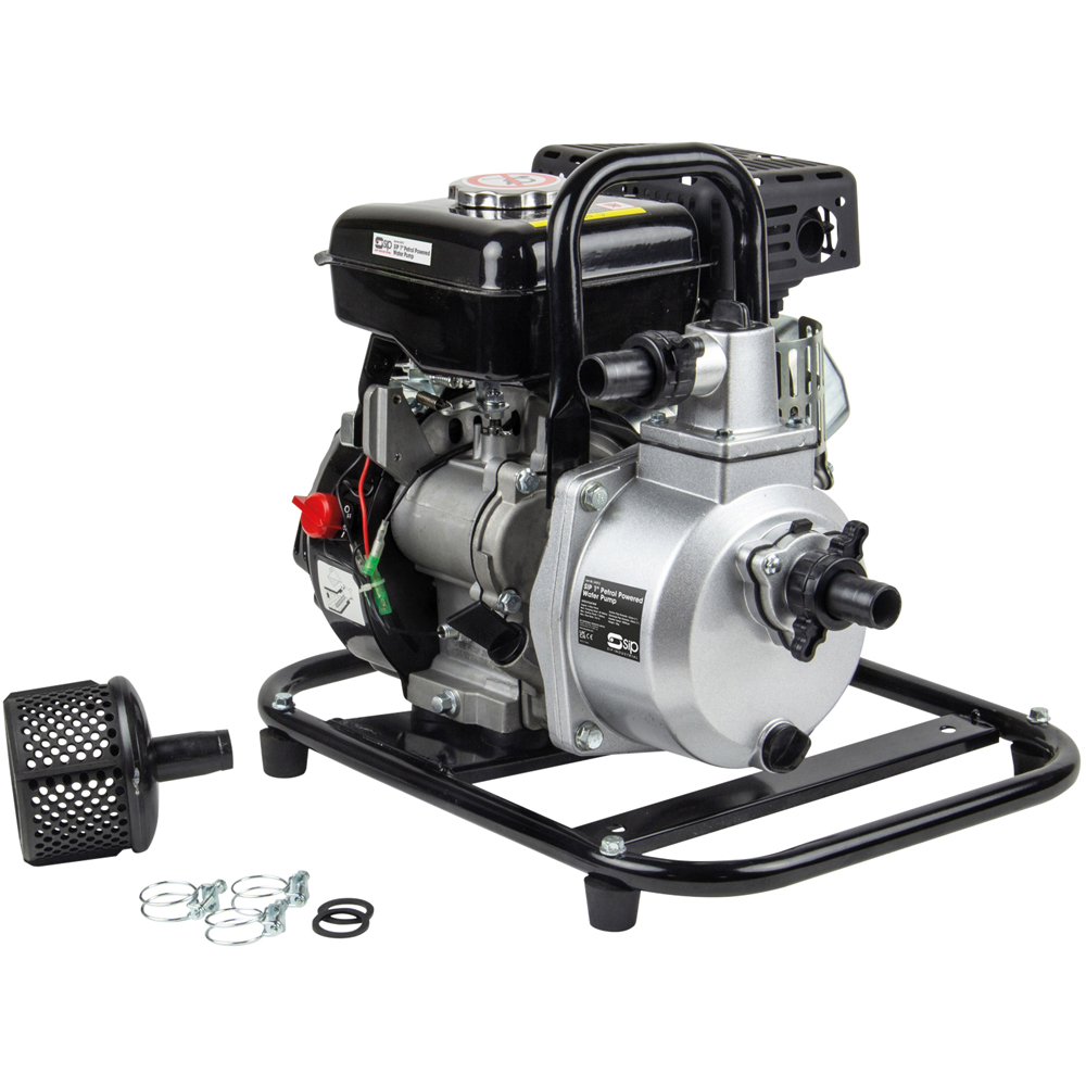 The SIP 1 inch Petrol Water Pump is built for ultimate durability in demanding general purpose pumping applications, with a tough cast iron impeller, volute housing, and low oil shutdown to help prevent engine damage, all of which extend life. Heavy-duty 2.6hp (1.9kW) EURO V petrol engine Powerful 116ltr/min flow rate for demanding tasks 30mtr max. pumping head and 7mtr max. suction head Cast iron impeller with heavy-duty volute housing Low oil shutdown helps to prevent engine damage Designed for heavy-duty pumping tasks Hose end strainers also included SIP 2-Year Standard Silver Warranty.