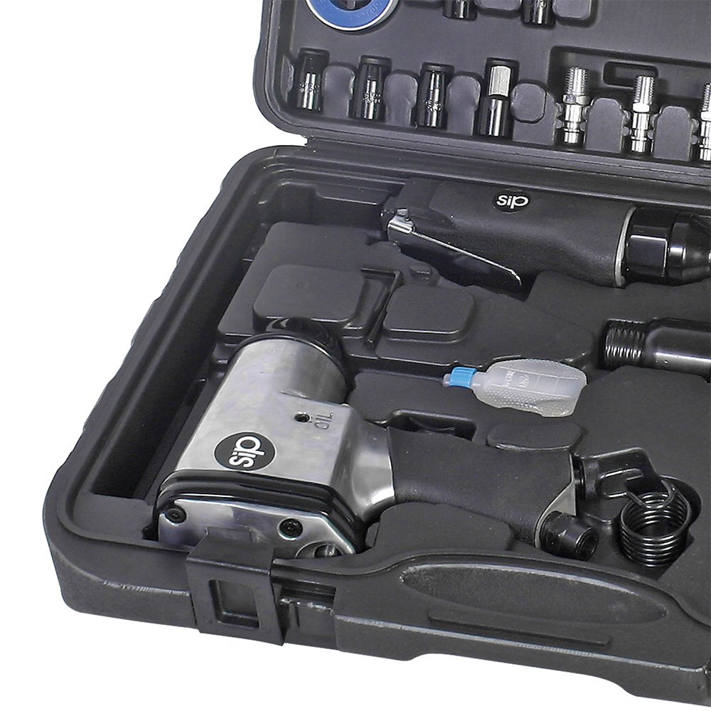 The SIP 73pc air tool kit is a comprehensive kit that features four heavy-duty SIP air tools and a range of accessories and consumables that perfectly complement them, ensuring that the user has everything required to get the job done in a range of applications in garage or workshop environments. The first of these tools is a SIP 1/2 inch air impact wrench, which boasts 312Nm (230ft/lb) torque and 7000rpm no-load speed, completed with 8x 1/2 inch sockets, 9/16 inch, 7/16 inch, 5/8 inch, 1/2 inch and more, plus a 3 inch extension. It is perfect for quick turning of bolts and fastenings. The SIP 3/8 inch reversible air ratchet offers easy work on engines, spark plugs, pumps, bodywork, radiators, and more, boasting 68NM (50ft/lb) torque and 160rpm no-load speed. Completed with 3/8 inch and 1/2 inch drive socket adaptors, 4 sockets (8mm, 9mm, 5/16 inch and 3/8 inch), 3/8 inch screwdriver, and 10 common screw bits. The SIP air die grinder is perfect for grinding, sanding, and polishing applications, with a 22,000rpm no-load speed offering high efficiency. Ten grindstones, a 3/8 inch collet, 1 inch and 3/4 inch sanding drums, 10 sanding sleeves, and 2 wrenches complete this subset. Finally, a 4500bpm SIP 150mm air hammer is perfect for cutting out rivets and other automotive repair applications. It is supplied with 4 chisel bits. A blow gun, 5 nozzles, 4 bayonets, pressure gauge, hex key, PTFE tape, 1/4 inch line coupler, and jubilee clip complete the 73pc kit. All of these tools, consumables, and accessories are supplied in a heavy-duty blow-moulded storage carry case.