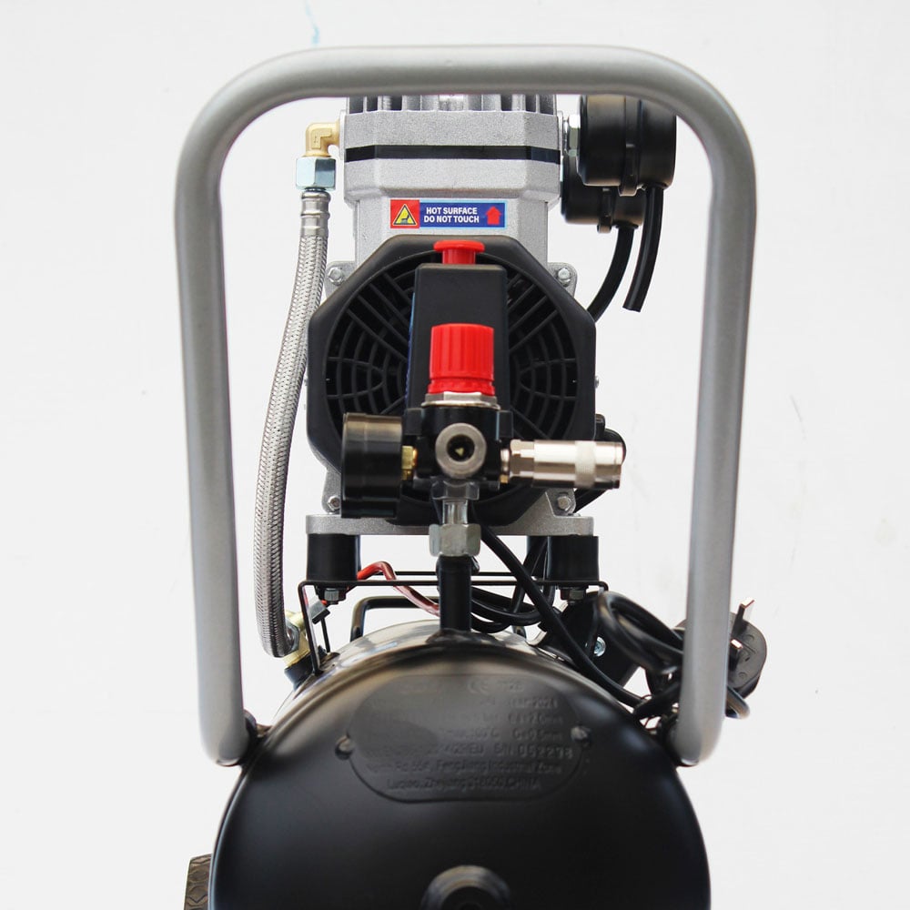 The SIP QT AIR 1.5hp 24L uLa-low noise oil-free direct drive compressor is an innovative uLa-low noise air compressor that features a slow-running 4-pole motor pump unit for longer life performance. Ideal for small-sized work areas, mobile applications, and home workshops, this oil-free compressor offers versatile and low maintenance use at 59 dB. The direct drive pump has a piston displacement resulting in 6.5CFM free air delivery for a consistent air supply, ideal for inflation tasks, nailing, stapling, and airbrushing. A wheel-mounted design with a U-handle allows for full movement in a variety of work area settings for added flexibility. Applications and uses: ideal for small-sized work areas, mobile applications, and home workshops. Perfect for inflation tasks, nailing, stapling, and airbrushing. The large twin-cylinder motor pump unit with a slow-running 4-pole motor achieves low noise levels and high airflow, plus oil-free for low maintenance use. The slow-running 4-pole motor operates at lower speeds for longer life performance (1.5hp / 1.1kW). The powerful motor pump unit operates at an uLa-low 59dB and supports high airflow with piston displacement and 6.5CFM free air delivery. A large motor fan improves cooling to maintain pump temperature and output. Oil-free for low maintenance use ensures no carry-through, delivering cleaner air to tools and equipment, and it also transports more easily compared to oil-lubricated models with more potential to spill. The braided delivery hose offers added durability. The receiver tank safely stores compressed air ready for application use, maintaining a consistent supply of air up to 8 bar air pressure for inflation tasks, nailing, stapling, and airbrushing. Tank pressure and working pressure gauges with a regulator optimize delivery, providing an accurate display of current pressure for enhanced user operation. Twin quick-release air connectors offer greater application versatility. The adjustable regulator (0 - 8 bar) optimizes air requirements to both quick-release connectors and is fitted with a quick-release receiver condensate drain valve. The hard-wearing wheel kit with a U-handle provides outstanding mobility around the work area, allowing full movement in a variety of work area settings for added flexibility. SIP provides a two-year standard silver warranty.