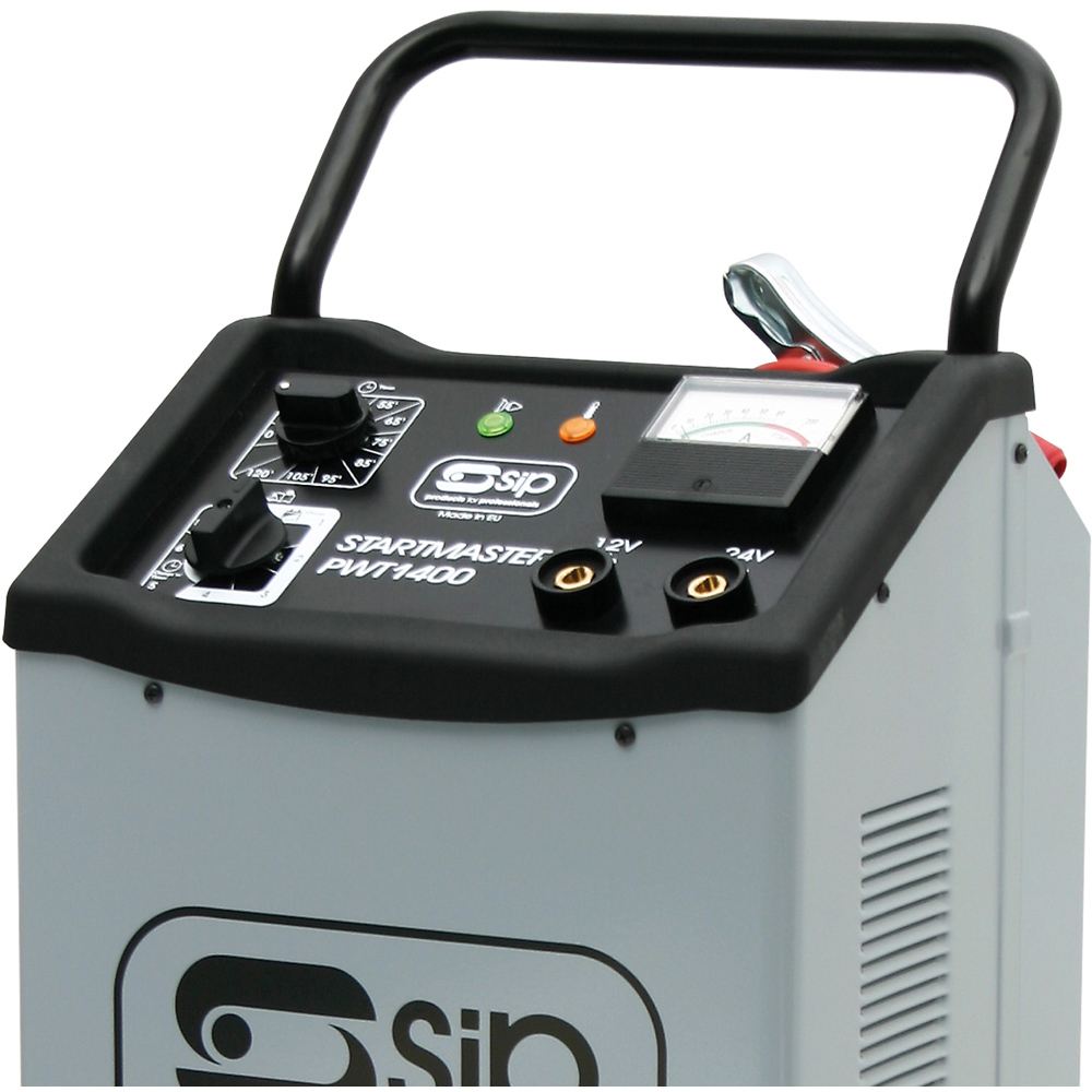 The SIP STARTMASTER PWT1400 Battery Starter Charger offers powerful performance from a mobile and wheel-mounted design, complete with a durable metal casing. Perfect for easily jump-starting cars and small vehicles. The STARTMASTER PWT1400 is compatible with batteries including Lead Acid, SLA, AGM, GEL, WET, and VRLA. Ideal for a range of garages and workshops. A range of protections, including reverse polarity, short circuit, and overload protection, provides added peace of mind and increased user safety. 12 V / 24 V charging voltage and 700 A max. boost rate. 400 Ah max. battery capacity and 90 A charging current. Six powerful charge rate settings for added versatility. Integrated clear, easy-to-read ammeter for high accuracy. Mobile wheel-mounted design with durable metal casing. Reverse polarity, short circuit, and overload protections. Quality design, including crocodile clamps and leads. Integrated charging timer for added functionality. Remote lead for easy one-person operation. SIP 2-year standard silver warranty. Manufactured in Italy.