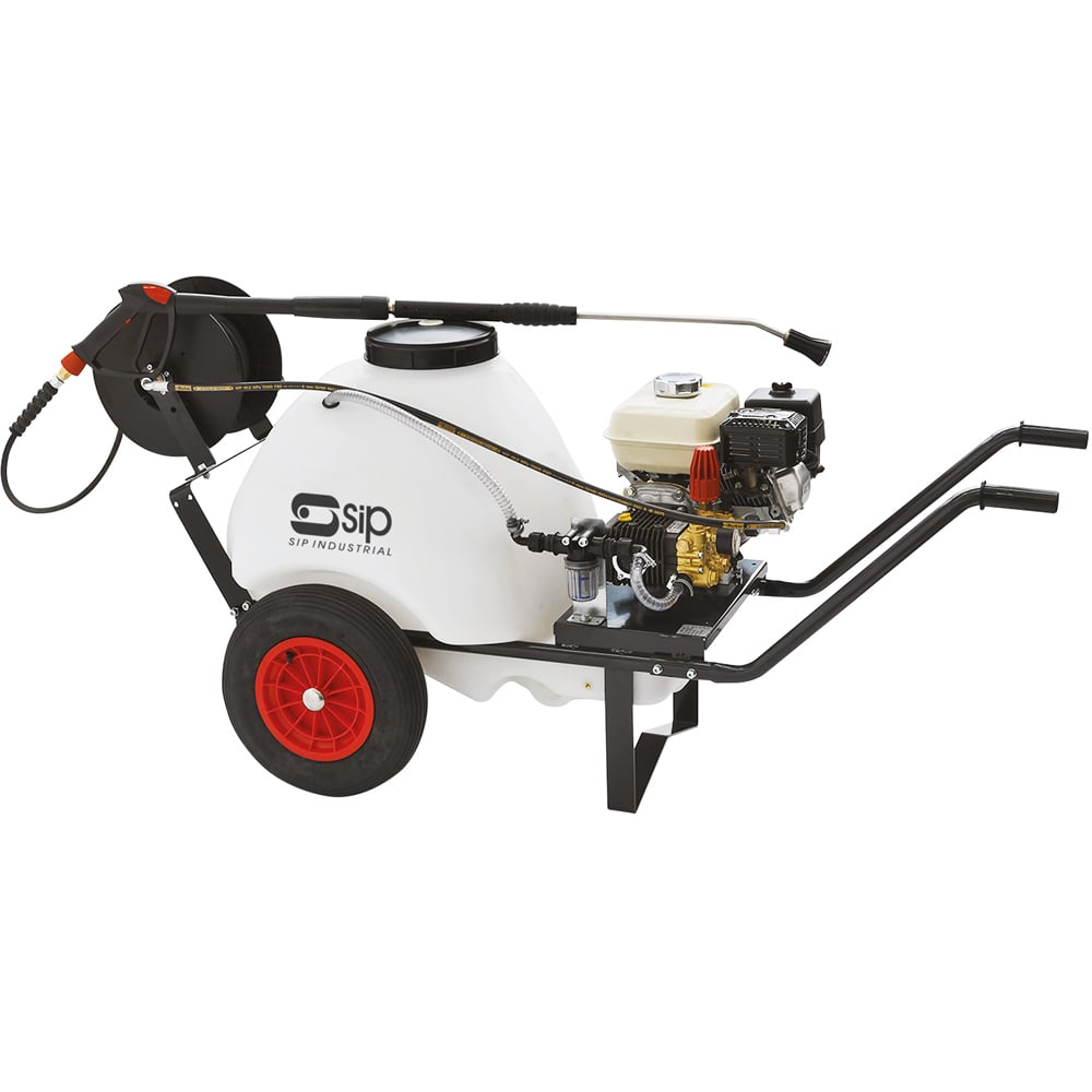 The SIP TEMPEST PPB480/160 Bowser Petrol Pressure Washer is ideal for powerful use in a variety of demanding cleaning applications, particularly in public environments including cleaning pavements, graffiti removal, signage, public transport and more. With a large 120L water tank manufactured from heavy-duty polyethene and a wheel-mounted design, this mobile solution does not rely on a mains water supply. A selection of heavy-duty components, including a HONDA GX160 163cc EURO V petrol engine and all-metal brass-headed in-line COMET Triplex crankshaft pump, the PPB480/160 embodies powerful performance and durability. A bent lance with an adjustable rotating nozzle and a fan-shaped nozzle, plus a robust spray gun with swivel connector, provides additional versatility and cleaning performance. 2320psi (160bar) max. pressure and 420ltr/hr flow rate. Heavy-duty HONDA GX160 163cc EURO V petrol engine. All-metal brass-headed in-line COMET Triplex crankshaft pump. A large 120L polyethylene tank means no mains water supply needed. Large puncture-proof wheels for easy movement over uneven terrain. Bent lance with adjustable rotating nozzle and a fan-shaped nozzle. Supplied with a robust spray gun with an integrated swivel connector. Suction filter with readily serviceable external filter at inlet. 15mtr hose and integrated storage reel to keep the hose tidy. Regulated low-pressure detergent suction. Fitted with a professional unloader valve. SIP 2-Year Standard Silver Warranty. HONDA 3-Year Engine Warranty. Manufactured in Italy.
