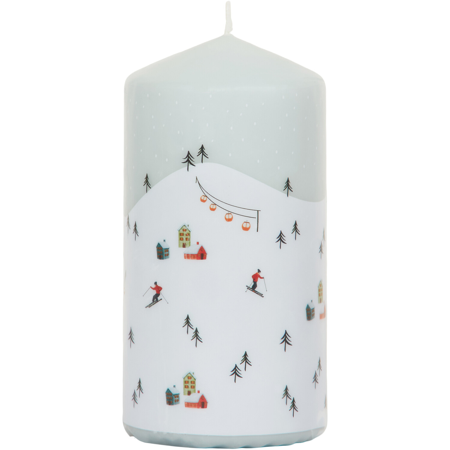 Enhance the aesthetic of any space with this Ski Scene Pillar Candle. This stylish candle adds a touch of elegance to your home décor with its intricate ski scene print. Crafted for luxury, it serves as a great gift for your loved ones or a sophisticated addition to your own collection. Perfect for creating a cosy atmosphere, this candle combines beauty and function to create a truly exceptional decoration item.