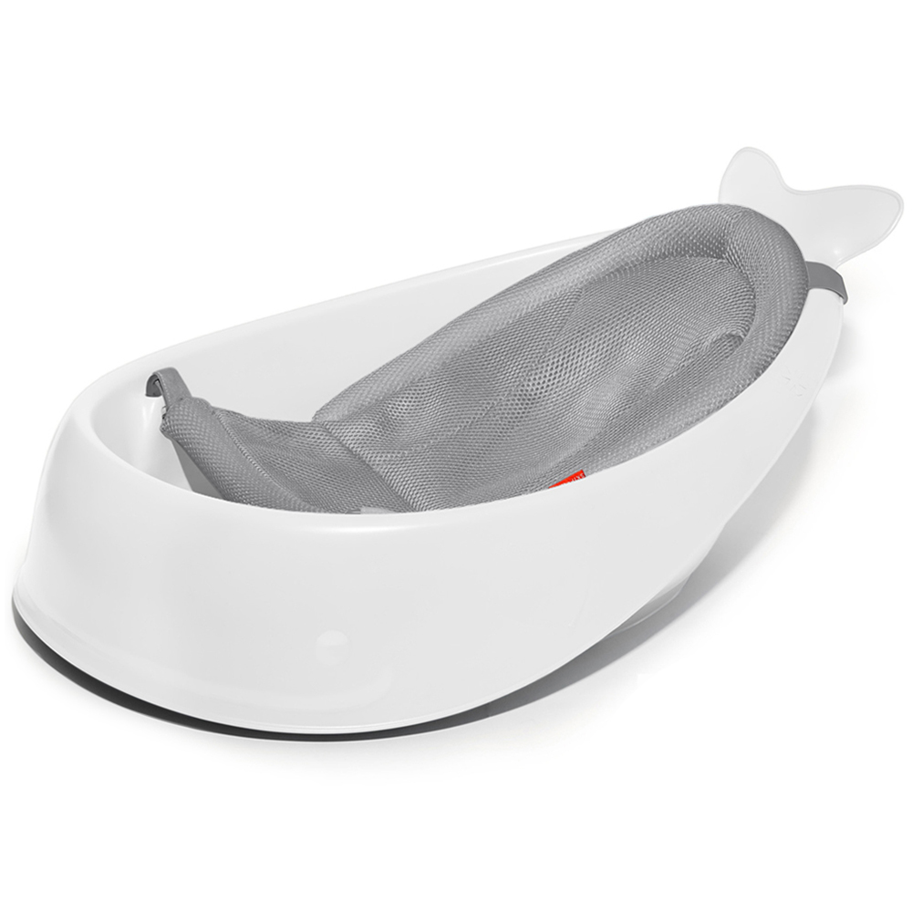 This versatile bathtub grows with baby through three stages and is the only baby bath tub you'll ever need. The sling locks into two ergonomic positions: higher for full-body support and lower for seated support. Dual layered mesh and comfort-edge construction securely cradles baby from head-to-toe. The slings adjusts to a cushioned seat that comfortably supports babies learning to sit. Remove the sling when baby has mastered sitting and easily bathe baby in the spacious tub - no uncomfortable plastic bumps. The new innovative rinser features interior fins that channel a steady flow of water to ensure quick cry-free rinses. A soft rubber lip fits snuggly to the forehead, preventing water from getting in eyes. The easy grip handle allows you to hold the rinser in one hand and baby in the other.