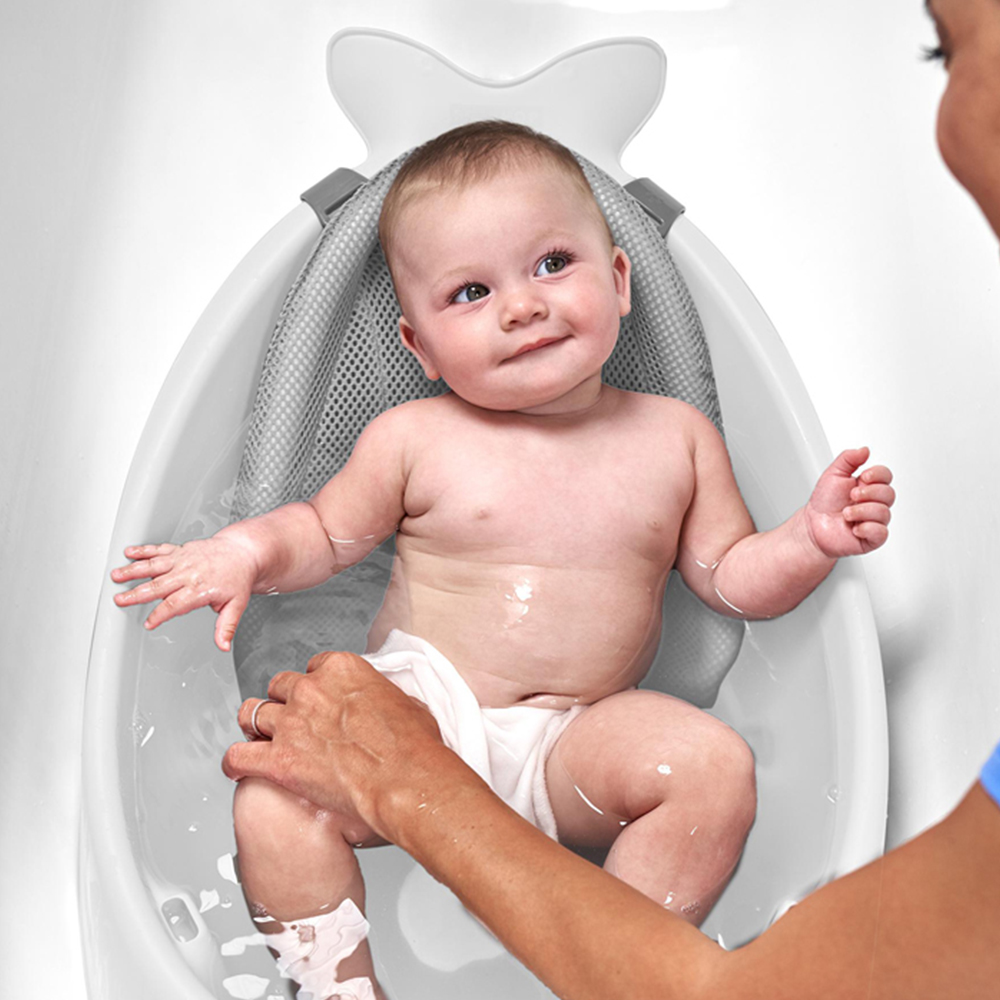 Add your and your child's comfort with Skip Hop Moby White Smart Sling 3 Stage Tub. The sling locks into two ergonomic positions: higher for full-body support and lower for seated support. Quick-drying mesh and comfort-edge construction securely cradles baby from head-to-toe. The slings adjusts to a cushioned seat that comfortably supports babies learning to sit. Remove the sling when baby has mastered sitting and easily bathe baby in the spacious tub—no uncomfortable plastic bumps. It grows with baby through 3 stages with stage 1: Newborn, with 0-3 months; up to 15 lbs, stage 2: Infant, with 3-6 months; up to 20 lbs, stage 3: Sitters, with 6+ months; up to 25 lbs.