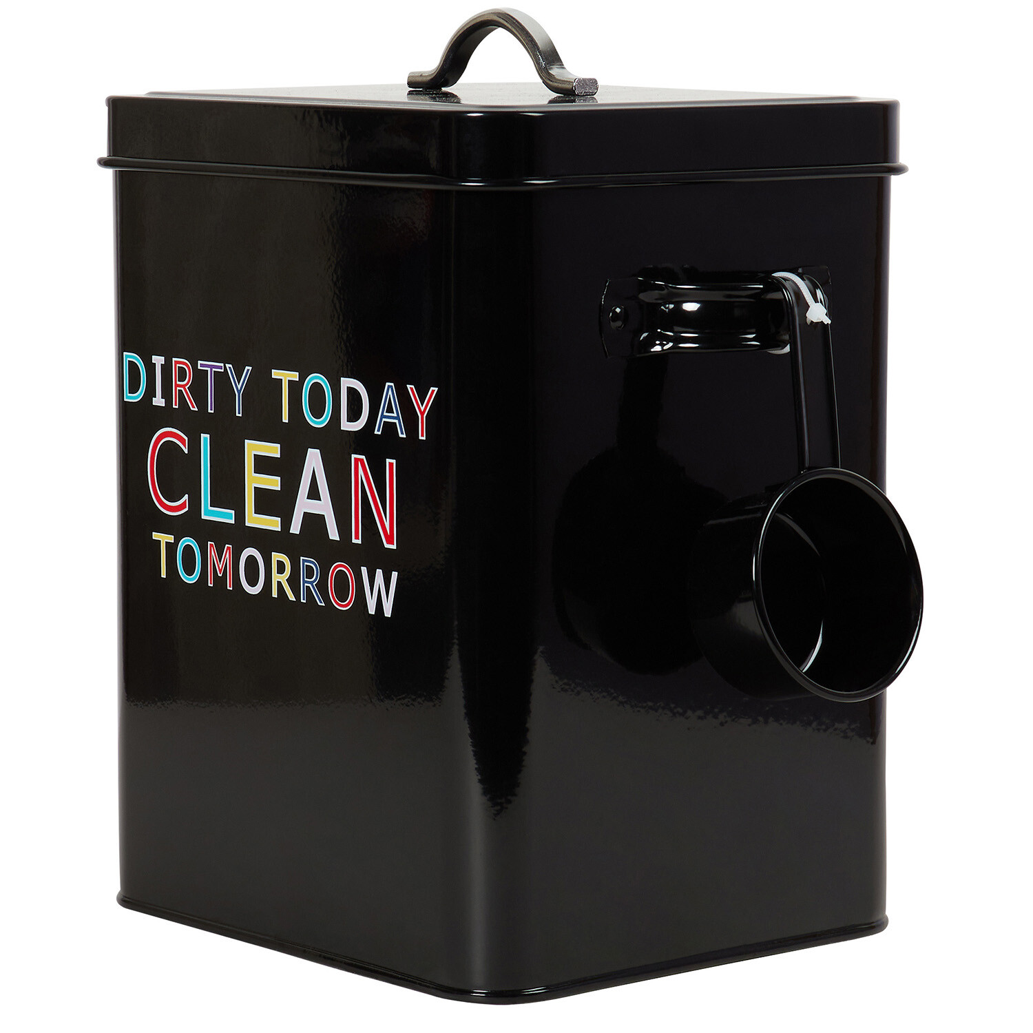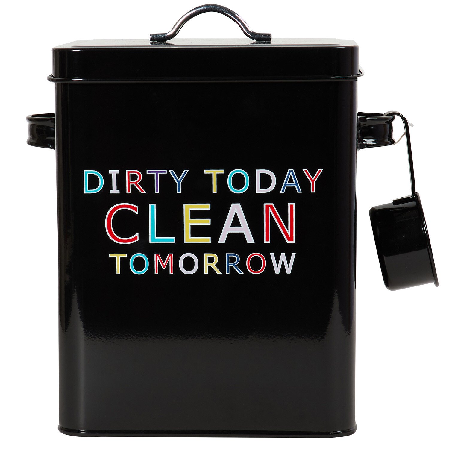 Keep your favourite detergent neatly stored with this Slogan Laundry Powder Storage Box. This glossy black box features colourful text that reads 'Dirty Today Clean Tomorrow' for a bold and fun design. Complete with a metal scoop, it creates a fun element for doing your laundry and updates your utility room or cupboard.